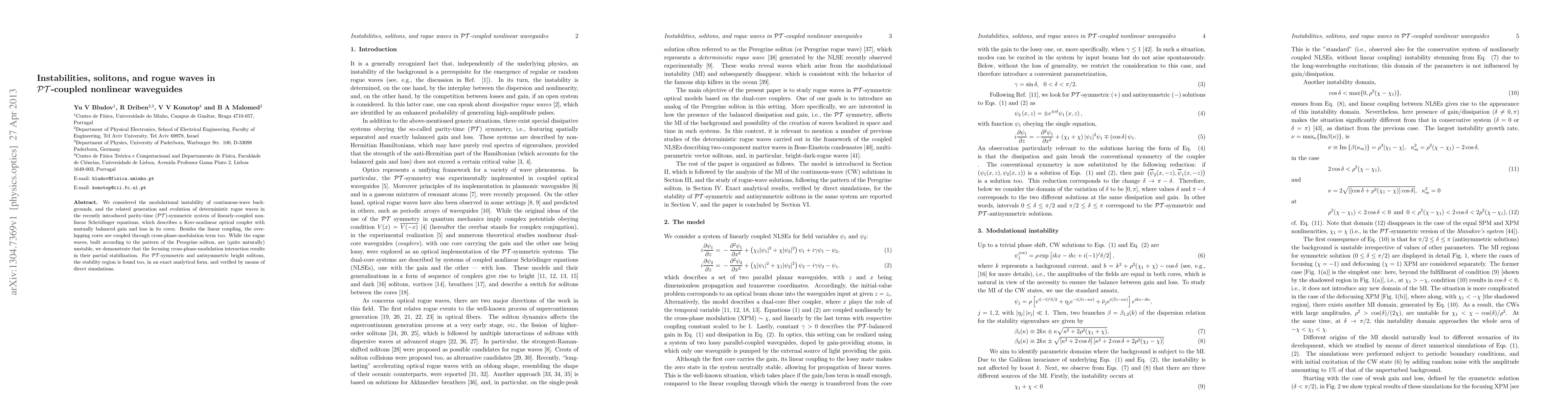 This paper investigates the modulational instability in PT-symmetric nonlinear waveguides, focusing on the generation and stabilization of rogue waves through cross-phase-modulation. Analytical and simulation results reveal the conditions under which rogue waves and solitons remain stable.