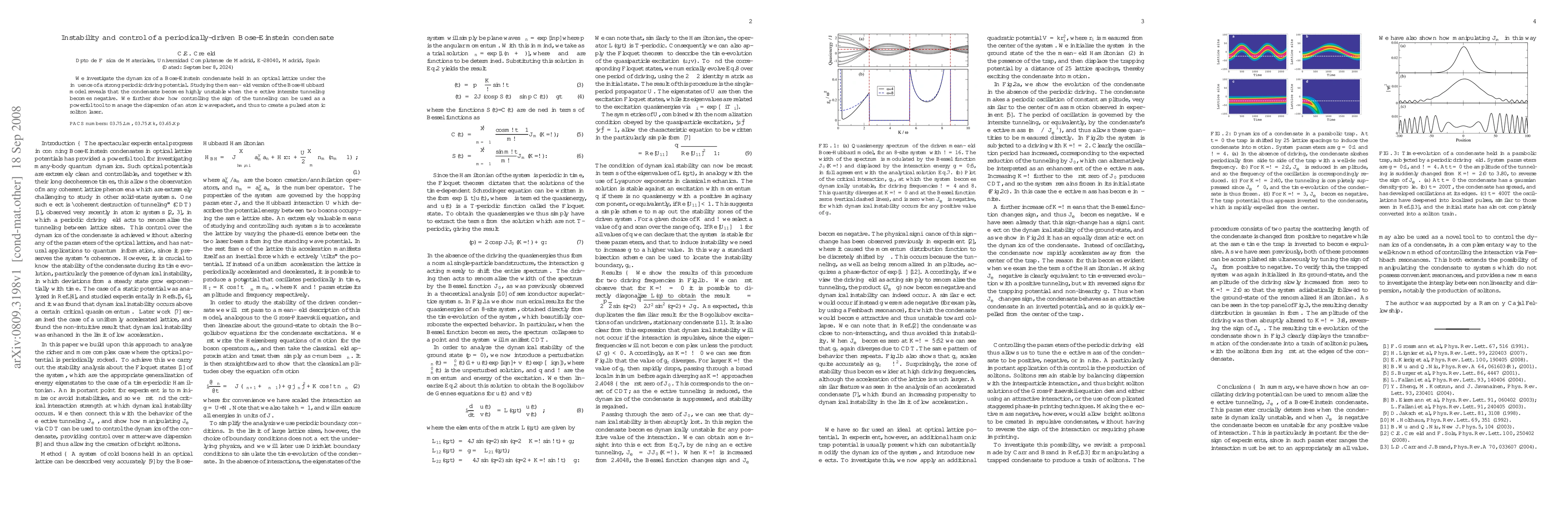 This paper examines the dynamics of a Bose-Einstein condensate in an optical lattice under periodic driving, finding instability when intersite tunneling turns negative. The study demonstrates that controlling tunneling sign can manage atomic wavepacket dispersion, enabling the creation of a pulsed atomic soliton laser.