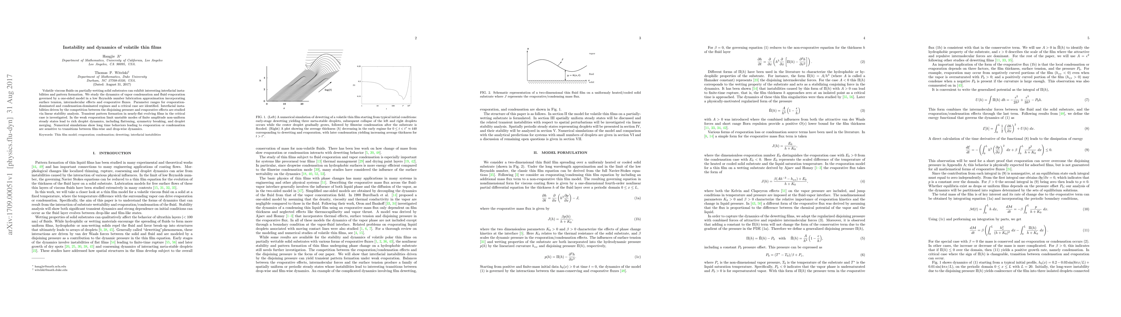 Researchers studied the dynamics of volatile thin films on partially-wetting surfaces, identifying parameter ranges for evaporation-dominated and condensation-dominated regimes. They found that interfacial instabilities can lead to transient pattern formation, including droplet dynamics such as flattening and merging.