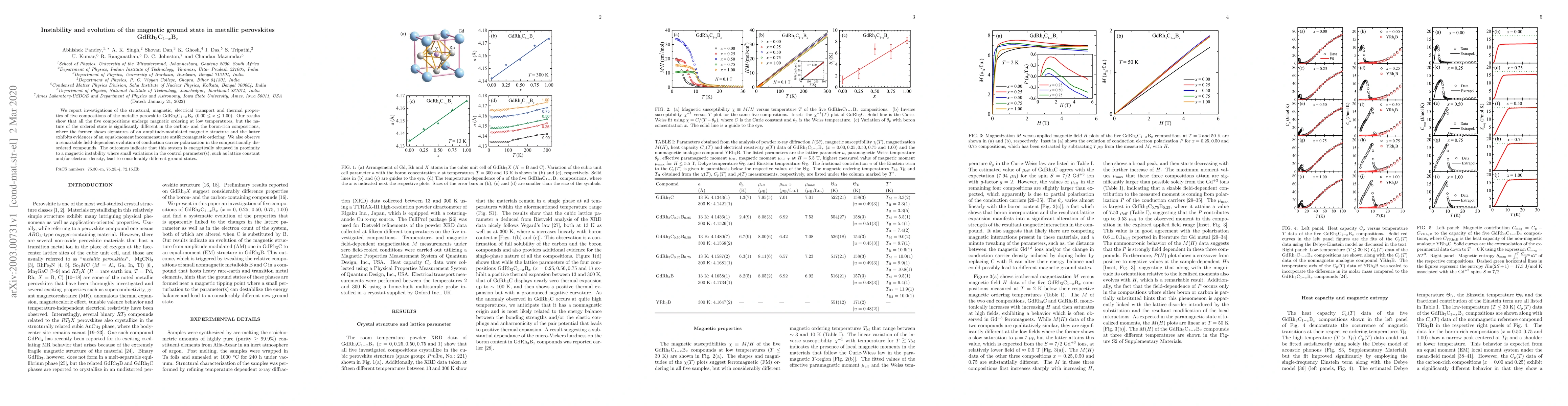 We report investigations of the structural, magnetic, electrical transport and thermal properties of five compositions of the metallic perovskite GdRh$_3$C$_{1-x}$B$_x$ ($0.00 \le x \le 1.00$). Our results show that all the five compositions undergo magnetic ordering at low temperatures, but the nature of the ordered state is significantly different in the carbon- and the boron-rich compositions, where the former shows signatures of an amplitude-modulated magnetic structure and the latter exhibits evidences of an equal-moment incommensurate antiferromagnetic ordering. We also observe a remarkable field-dependent evolution of conduction carrier polarization in the compositionally disordered compounds. The outcomes indicate that this system is energetically situated in proximity to a magnetic instability where small variations in the control parameter(s), such as lattice constant and/or electron density, lead to considerably different ground states.