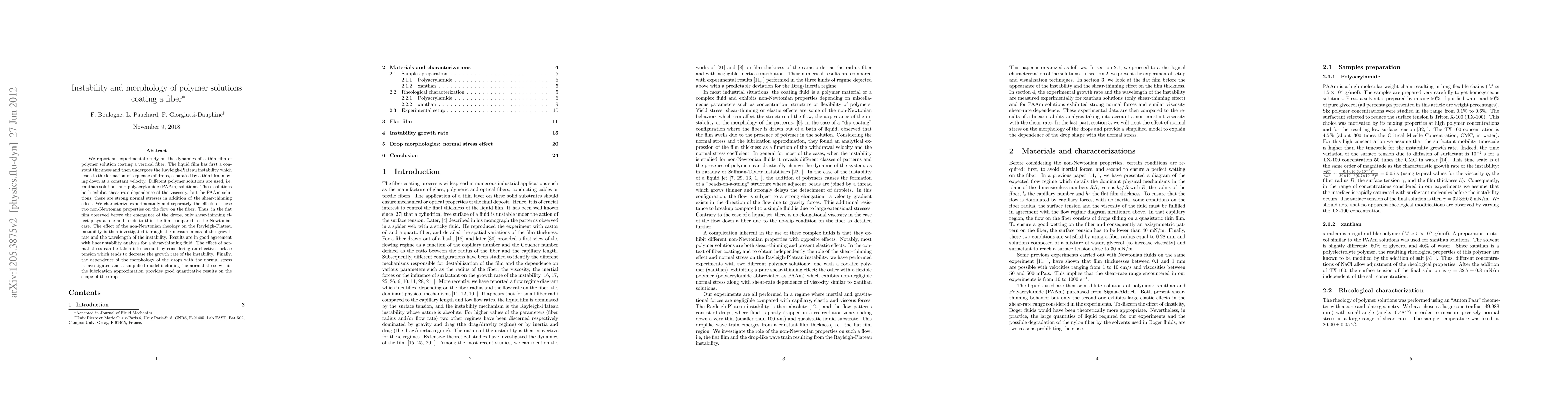 We report an experimental study on the dynamics of a thin film of polymer solution coating a vertical fiber. The liquid film has first a constant thickness and then undergoes the Rayleigh-Plateau instability which leads to the formation of sequences of drops, separated by a thin film, moving down at a constant velocity. Different polymer solutions are used, i.e. xanthan solutions and polyacrylamide (PAAm) solutions. These solutions both exhibit shear-rate dependence of the viscosity, but for PAAm solutions, there are strong normal stresses in addition of the shear-thinning effect. We characterize experimentally and separately the effects of these two non-Newtonian properties on the flow on the fiber. Thus, in the flat film observed before the emergence of the drops, only shear-thinning effect plays a role and tends to thin the film compared to the Newtonian case. The effect of the non-Newtonian rheology on the Rayleigh-Plateau instability is then investigated through the measurements of the growth rate and the wavelength of the instability. Results are in good agreement with linear stability analysis for a shear-thinning fluid. The effect of normal stress can be taken into account by considering an effective surface tension which tends to decrease the growth rate of the instability. Finally, the dependence of the morphology of the drops with the normal stress is investigated and a simplified model including the normal stress within the lubrication approximation provides good quantitative results on the shape of the drops.