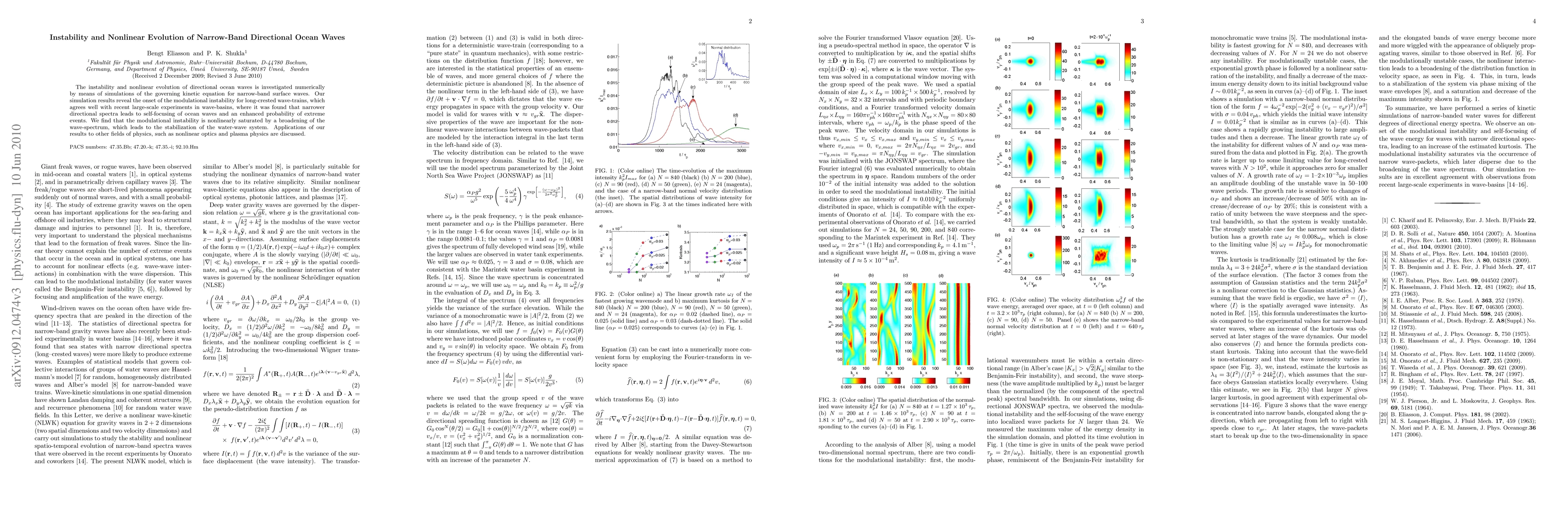 This paper investigates the instability and nonlinear evolution of narrow-band directional ocean waves using numerical simulations of the kinetic equation. It finds modulational instability in long-crested wave-trains, leading to self-focusing and extreme events, which is nonlinearly saturated by spectrum broadening.