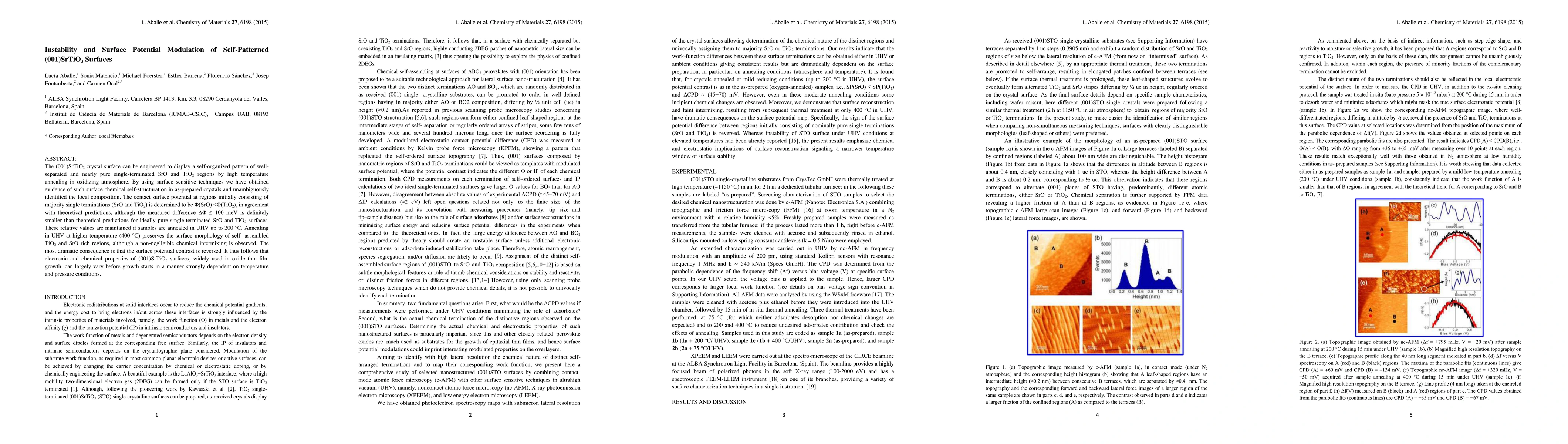 This paper investigates the self-patterned (001)SrTiO3 surface, revealing a self-organized pattern of SrO and TiO2 regions formed by high-temperature annealing. The study finds that the surface potential is lower for SrO regions compared to TiO2, with a smaller difference than theoretical predictions, and this pattern persists up to 200°C but reverses at higher temperatures, indicating significant variability in electronic and chemical properties based on annealing conditions.