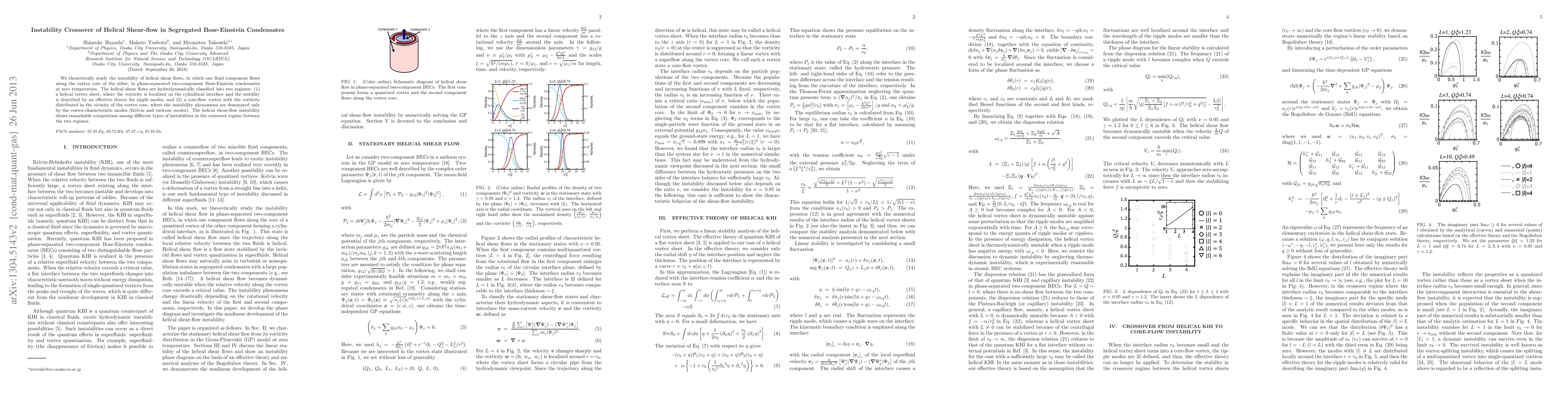 This paper investigates the instability of helical shear flows in segregated Bose-Einstein condensates, classifying them into two regimes: a helical vortex sheet and a core-flow vortex. It highlights the competition between different instability types in the crossover regime between these regimes.