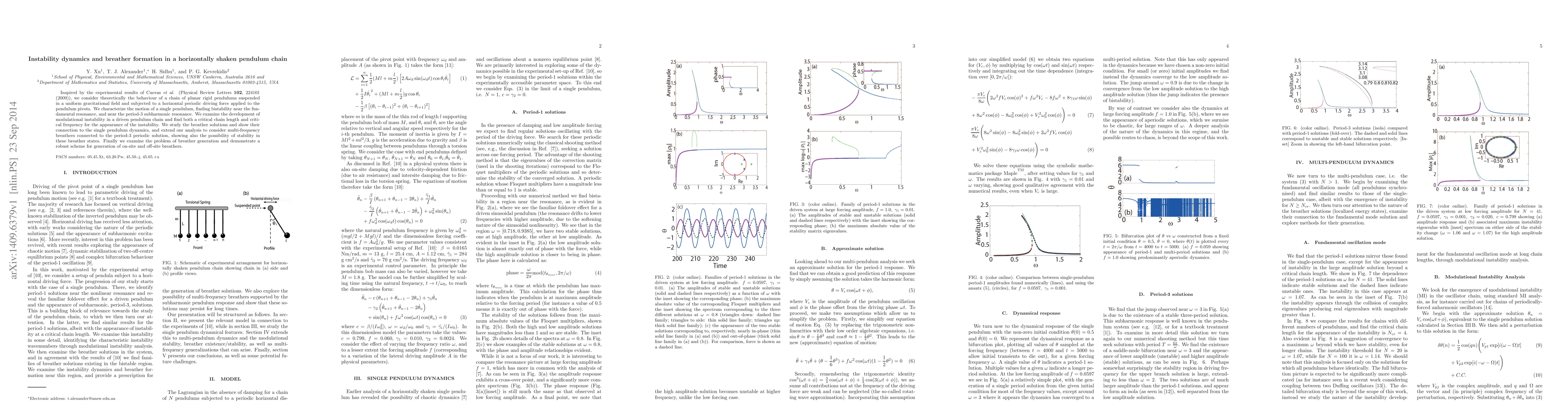 Researchers studied a chain of pendulums driven horizontally and found bistability near resonance points, breather solutions that connect to single-pendulum dynamics, and methods for generating on-site and off-site breathers.
