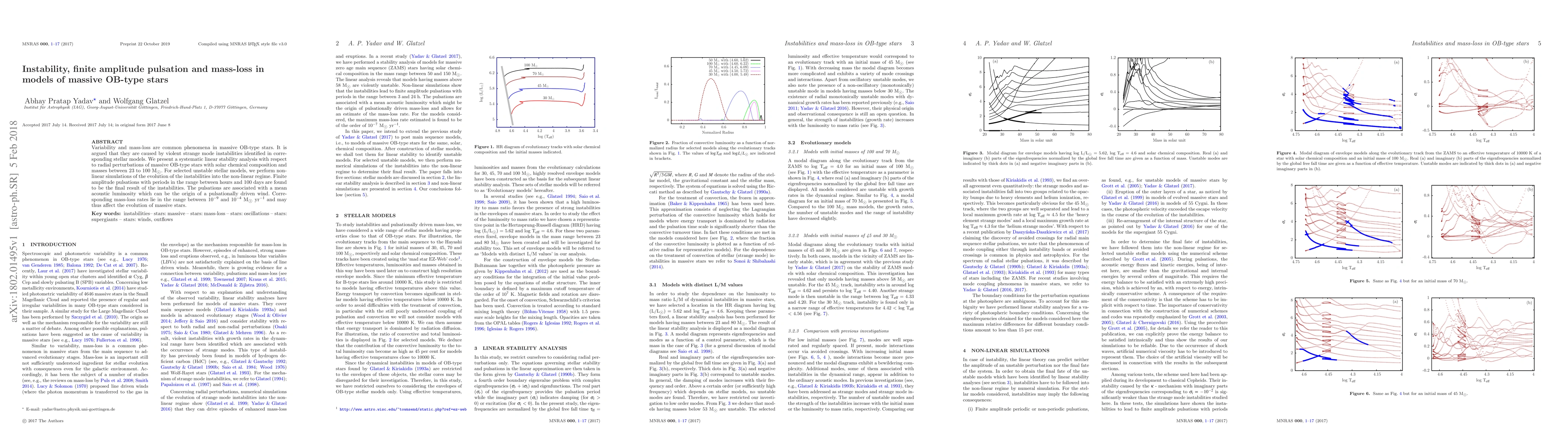 This paper investigates the instabilities, finite amplitude pulsations, and mass-loss in massive OB-type stars, attributing these phenomena to strange mode instabilities. Non-linear simulations of unstable stellar models reveal pulsations linked to significant mass-loss rates, potentially impacting the stars' evolution.