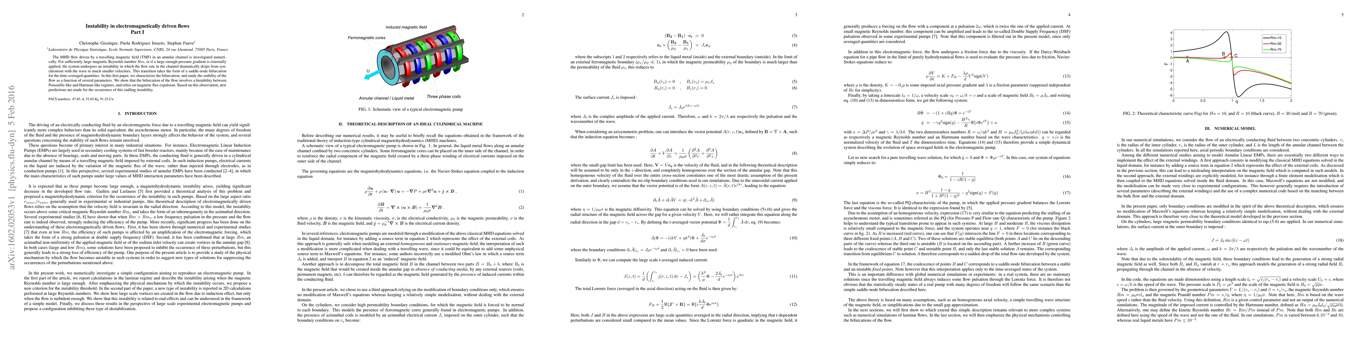 The MHD flow driven by a travelling magnetic field (TMF) in an annular channel is investigated numerically. For sufficiently large magnetic Reynolds number Rm, or if a large enough pressure gradient is externally applied, the system undergoes an instability in which the flow rate in the channel dramatically drops from synchronism with the wave to much smaller velocities. This transition takes the form of a saddle-node bifurcation for the time-averaged quantities. In this first paper, we characterize the bifurcation, and study the stability of the flow as a function of several parameters. We show that the bifurcation of the flow involves a bistability between Poiseuille-like and Hartman-like regimes, and relies on magnetic flux expulsion. Based on this observation, new predictions are made for the occurrence of this stalling instability.