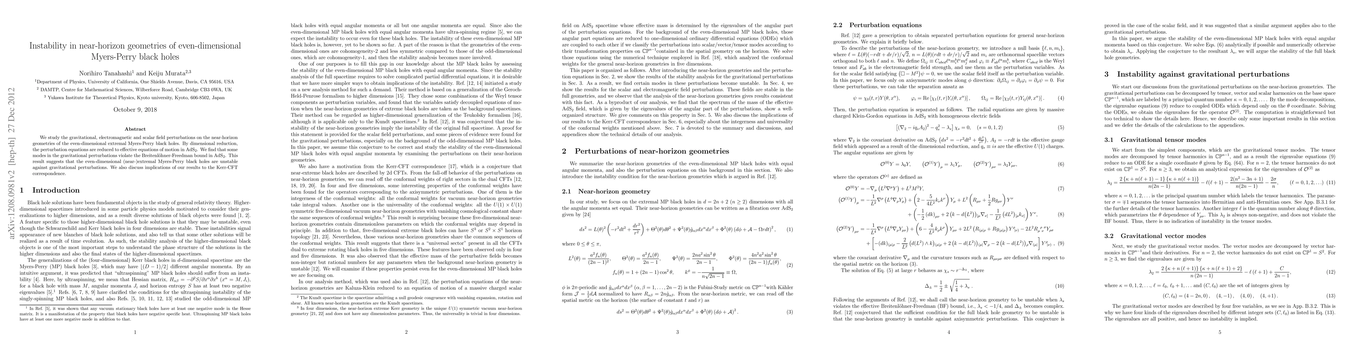This study examines perturbations in even-dimensional Myers-Perry black holes near their horizons, revealing that some gravitational modes violate stability bounds, indicating instability. The findings also have implications for the Kerr-CFT correspondence.