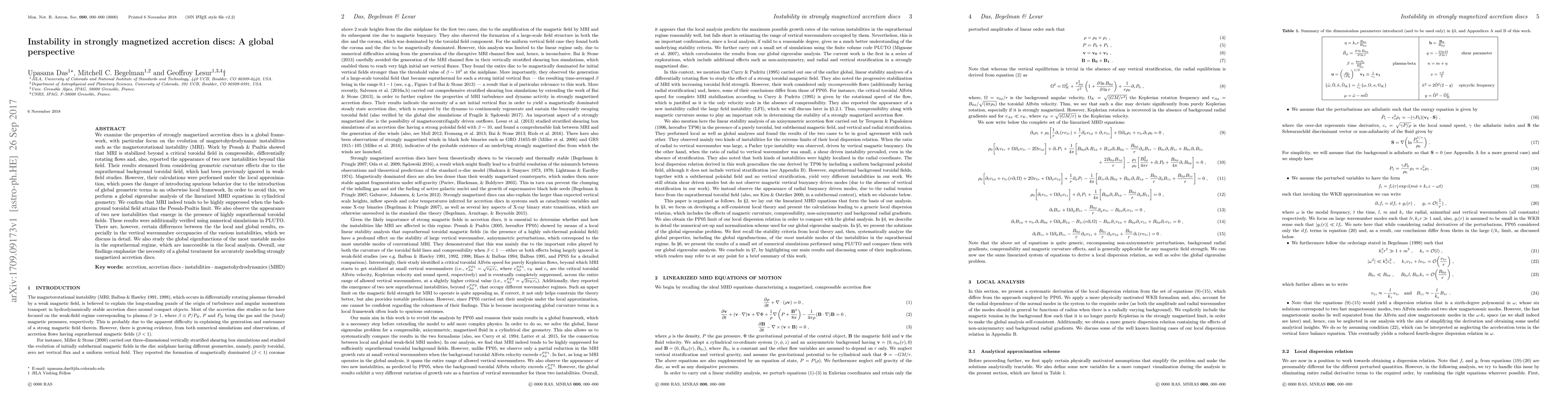 This paper investigates the magnetohydrodynamic instabilities in strongly magnetized accretion discs, confirming that the magnetorotational instability is suppressed beyond a critical toroidal field. It highlights the emergence of new instabilities and stresses the importance of a global analysis over local approximations to avoid spurious behavior, revealing differences in the vertical wavenumber occupancies and inaccessible eigenfunctions in the global treatment.