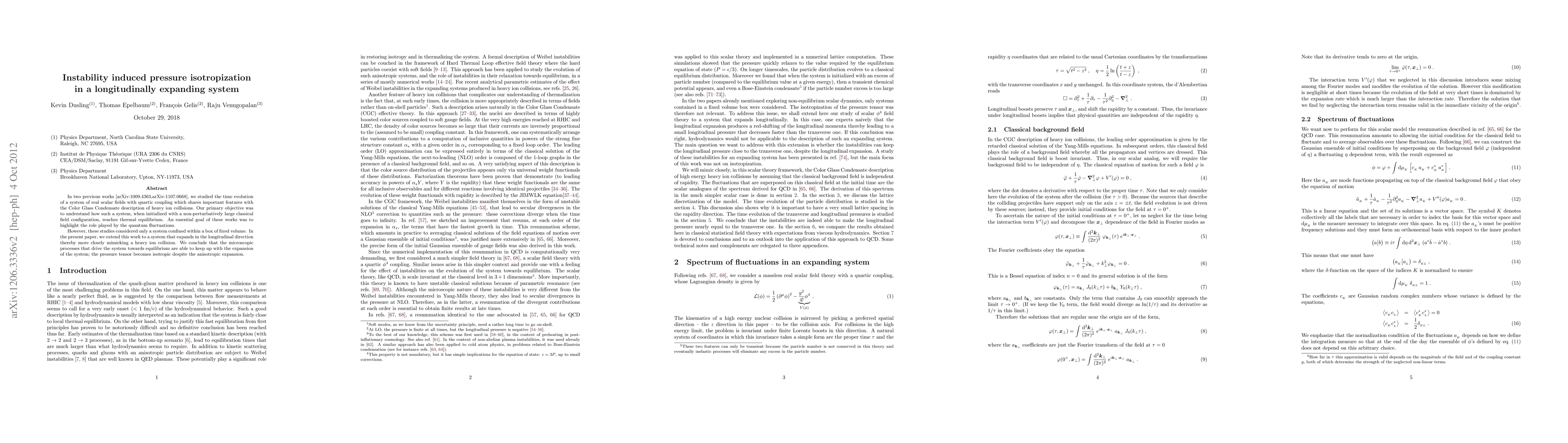 In two previous works [arXiv:1009.4363,arXiv:1107.0668], we studied the time evolution of a system of real scalar fields with quartic coupling which shares important features with the Color Glass Condensate description of heavy ion collisions. Our primary objective was to understand how such a system, when initialized with a non-perturbatively large classical field configuration, reaches thermal equilibrium. An essential goal of these works was to highlight the role played by the quantum fluctuations. However, these studies considered only a system confined within a box of fixed volume. In the present paper, we extend this work to a system that expands in the longitudinal direction thereby more closely mimicking a heavy ion collision. We conclude that the microscopic processes that drive the system towards equilibrium are able to keep up with the expansion of the system; the pressure tensor becomes isotropic despite the anisotropic expansion.