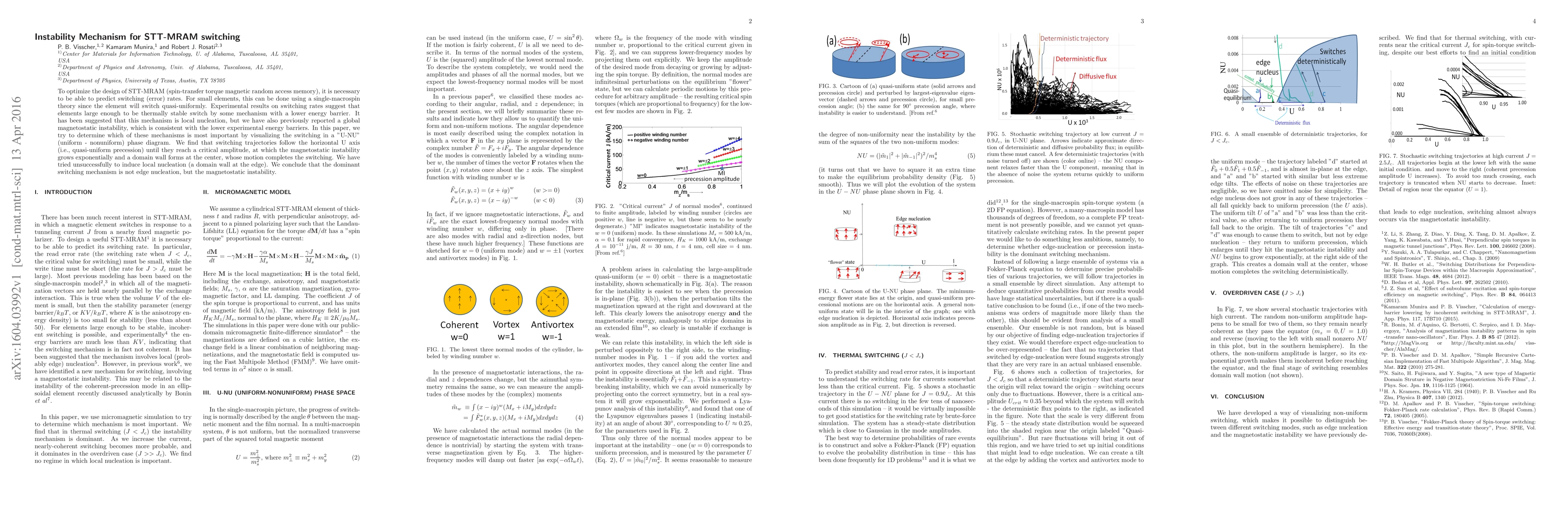 To optimize the design of STT-MRAM (spin-transfer torque magnetic random access memory), it is necessary to be able to predict switching (error) rates. For small elements, this can be done using a single-macrospin theory since the element will switch quasi-uniformly. Experimental results on switching rates suggest that elements large enough to be thermally stable switch by some mechanism with a lower energy barrier. It has been suggested that this mechanism is local nucleation, but we have also previously reported a global magnetostatic instability, which is consistent with the lower experimental energy barriers. In this paper, we try to determine which of these mechanisms is most important by visualizing the switching in a "U-NU" (uniform - nonuniform) phase diagram. We find that switching trajectories follow the horizontal U axis (i.e., quasi-uniform precession) until they reach a critical amplitude, at which the magnetostatic instability grows exponentially and a domain wall forms at the center, whose motion completes the switching. We have tried unsuccessfully to induce local nucleation (a domain wall at the edge). We conclude that the dominant switching mechanism is not edge nucleation, but the magnetostatic instability.