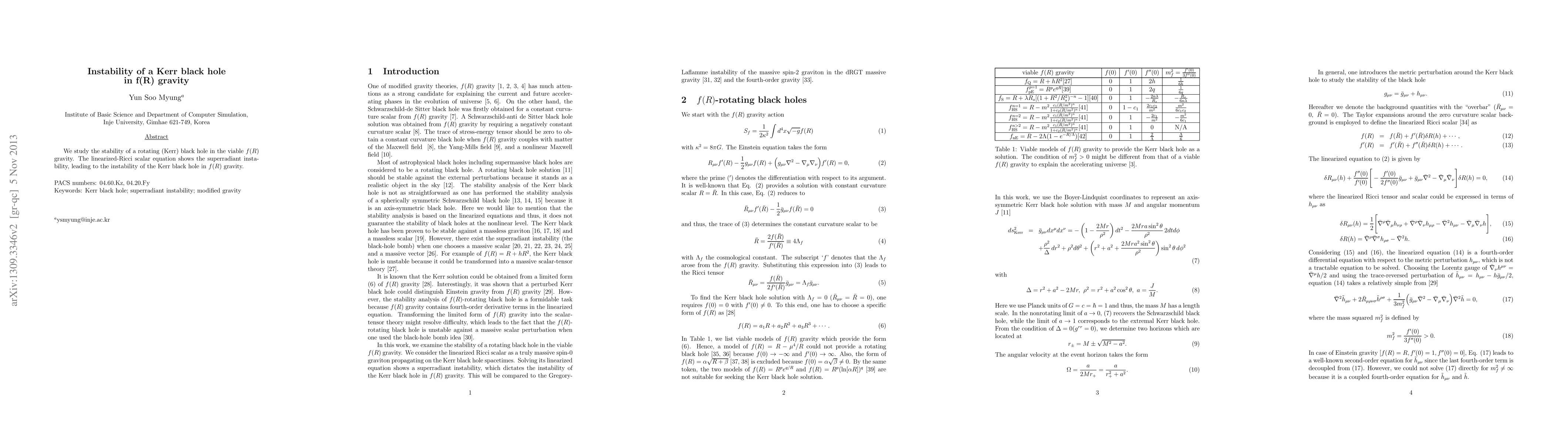 We study the stability of a rotating (Kerr) black hole in the viable $f(R)$ gravity. The linearized-Ricci scalar equation shows the superradiant instability, leading to the instability of the Kerr black hole in $f(R)$ gravity.