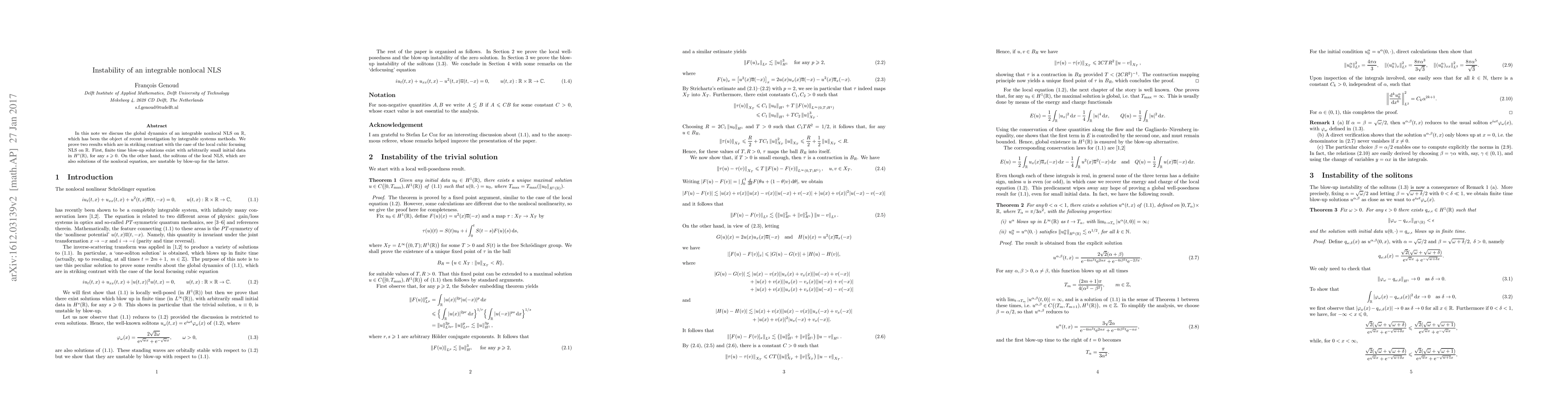 In this note we discuss the global dynamics of an integrable nonlocal NLS on $\mathbb{R}$, which has been the object of recent investigation by integrable systems methods. We prove two results which are in striking contrast with the case of the local cubic focusing NLS on $\mathbb{R}$. First, finite time blow-up solutions exist with arbitrarily small initial data in $H^s(\mathbb{R})$, for any $s\geqslant0$. On the other hand, the solitons of the local NLS, which are also solutions of the nonlocal equation, are unstable by blow-up for the latter.