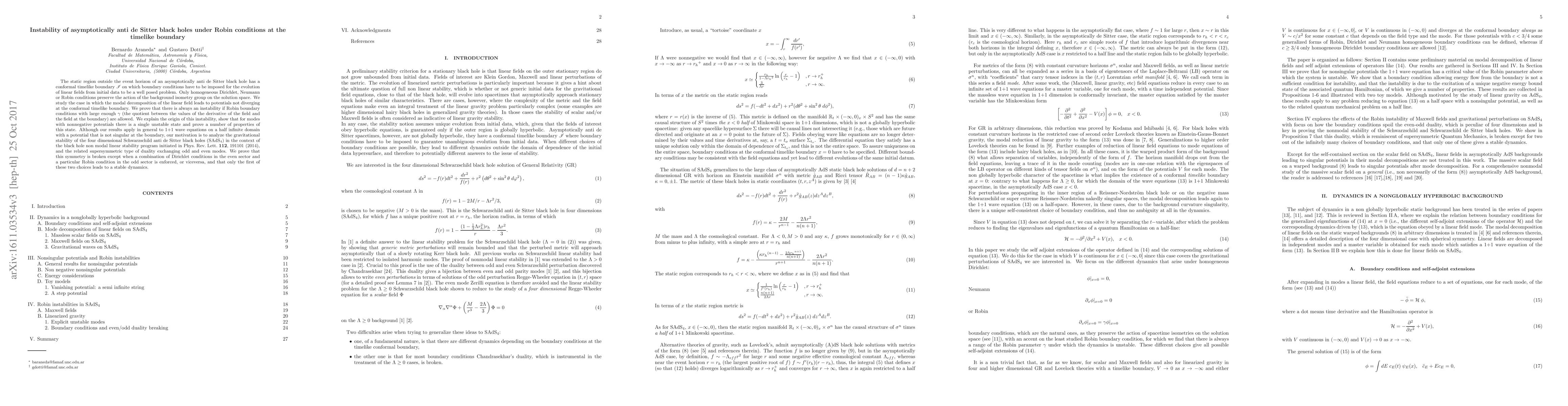 The static region outside the event horizon of an asymptotically anti de Sitter black hole has a conformal timelike boundary $\mathscr{I}$ on which boundary conditions have to be imposed for the evolution of linear fields from initial data to be a well posed problem. Only homogeneous Dirichlet, Neumann or Robin conditions preserve the action of the background isometry group on the solution space. We study the case in which the modal decomposition of the linear field leads to potentials not diverging at the conformal timelike boundary. We prove that there is always an instability if Robin boundary conditions with large enough $\gamma$ (the quotient between the values of the derivative of the field and the field at the boundary) are allowed. We explain the origin of this instability, show that for modes with nonnegative potentials there is a single unstable state and prove a number of properties of this state. Although our results apply in general to 1+1 wave equations on a half infinite domain with a potential that is not singular at the boundary, our motivation is to analyze the gravitational stability of the four dimensional Schwarzschild anti de Sitter black holes (SAdS${}_4$) in the context of the black hole non modal linear stability program initiated in Phys.\ Rev.\ Lett.\ {\bf 112}, 191101 (2014), and the related supersymmetric type of duality exchanging odd and even modes. We prove that this symmetry is broken except when a combination of Dirichlet conditions in the even sector and a particular Robin condition in the odd sector is enforced, or viceversa, and that only the first of these two choices leads to a stable dynamics.