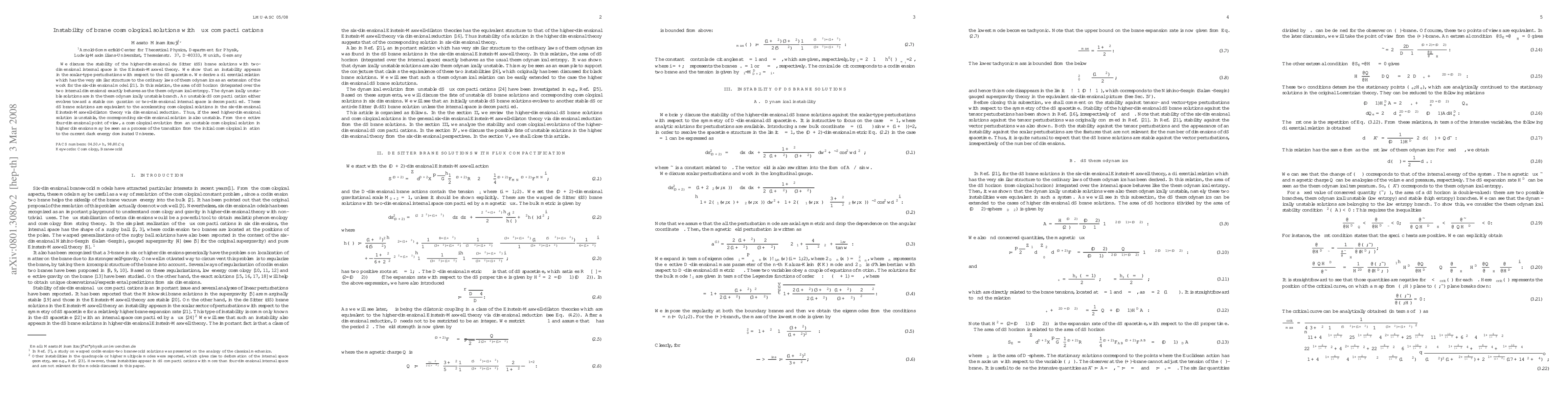 This paper investigates the stability of higher-dimensional de Sitter brane solutions in Einstein-Maxwell theory, revealing scalar-type perturbation instabilities. It establishes a thermodynamic relation where the dS horizon's area acts as entropy, indicating that unstable dS compactifications either evolve to stable states or decompactify.