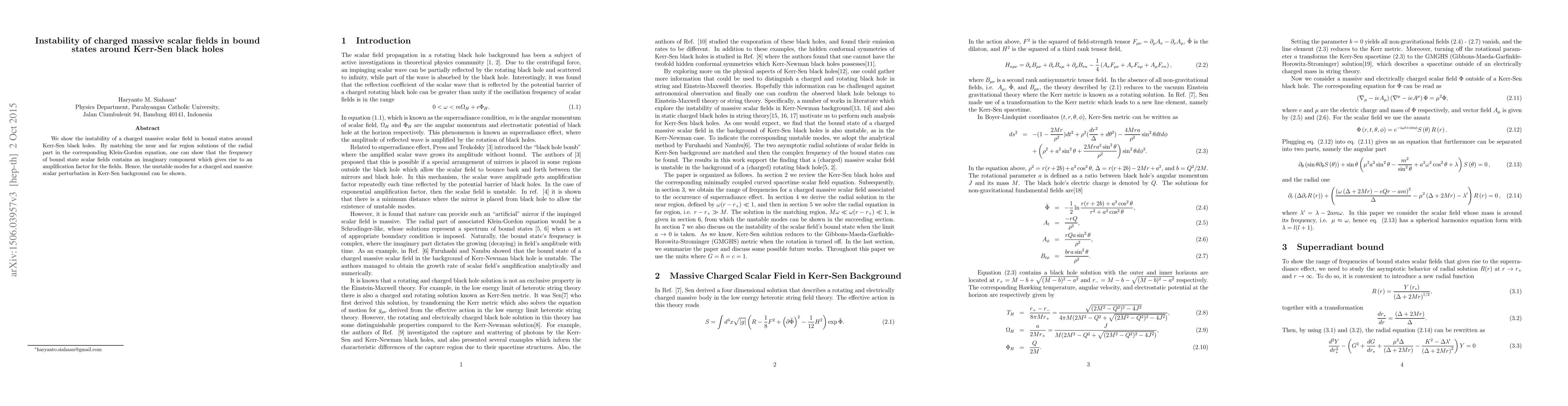 Summary: This research demonstrates the instability of charged massive scalar fields in bound states around Kerr-Sen black holes, showing that the bound state frequencies possess an imaginary component leading to field amplification, indicating unstable modes for such perturbations.