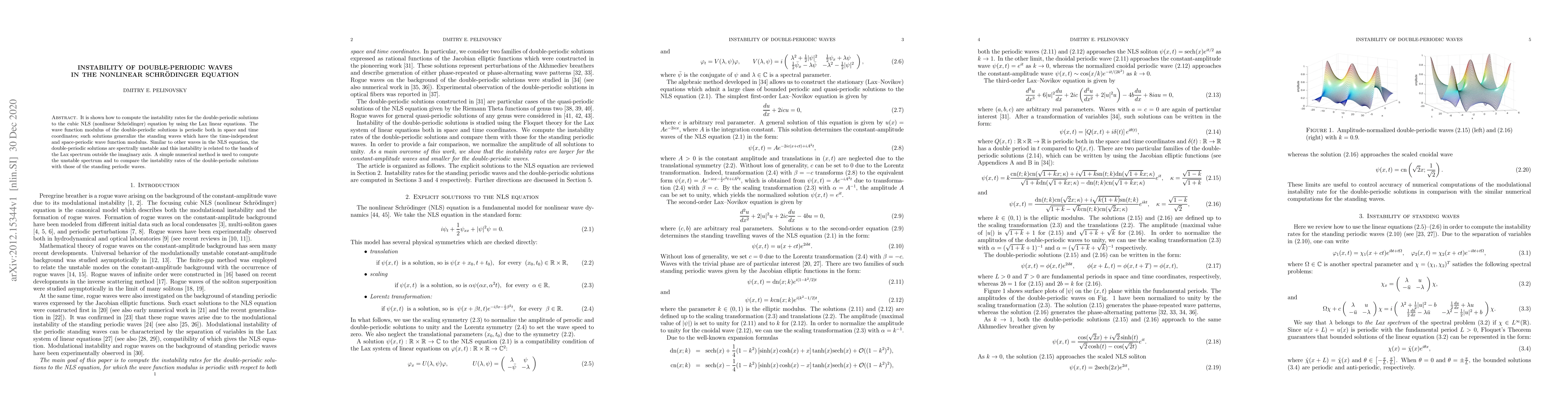 It is shown how to compute the instability rates for the double-periodic solutions to the cubic NLS (nonlinear Schrodinger) equation by using the Lax linear equations. The wave function modulus of the double-periodic solutions is periodic both in space and time coordinates; such solutions generalize the standing waves which have the time-independent and space-periodic wave function modulus. Similar to other waves in the NLS equation, the double-periodic solutions are spectrally unstable and this instability is related to the bands of the Lax spectrum outside the imaginary axis. A simple numerical method is used to compute the unstable spectrum and to compare the instability rates of the double-periodic solutions with those of the standing periodic waves.