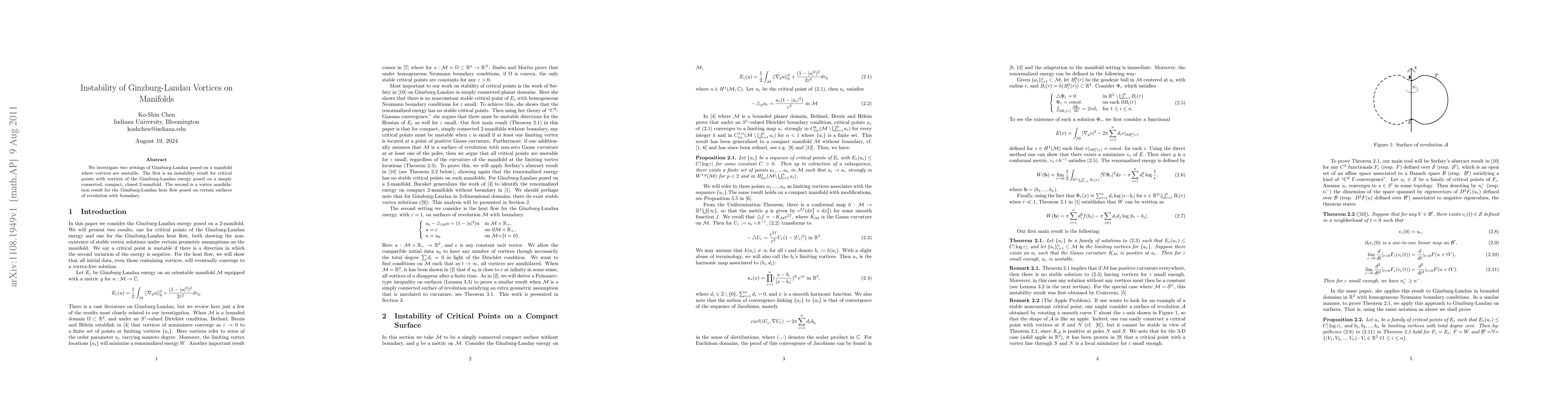 This paper explores instabilities in Ginzburg-Landau vortices on manifolds, demonstrating instability for critical points on compact, simply connected 2-manifolds and vortex annihilation for Ginzburg-Landau heat flow on surfaces of revolution with boundary.