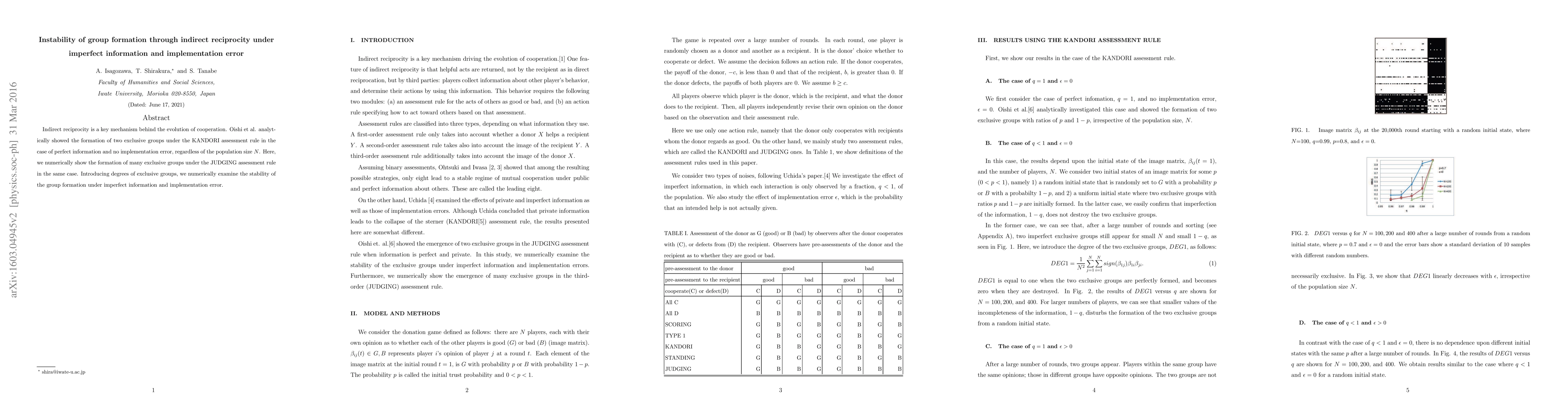 Indirect reciprocity is a key mechanism behind the evolution of cooperation. Oishi et al. analytically showed the formation of two exclusive groups under the KANDORI assessment rule in the case of perfect information and no implementation error, regardless of the population size $N$. Here, we numerically show the formation of many exclusive groups under the JUDGING assessment rule in the same case. Introducing degrees of exclusive groups, we numerically examine the stability of the group formation under imperfect information and implementation error.