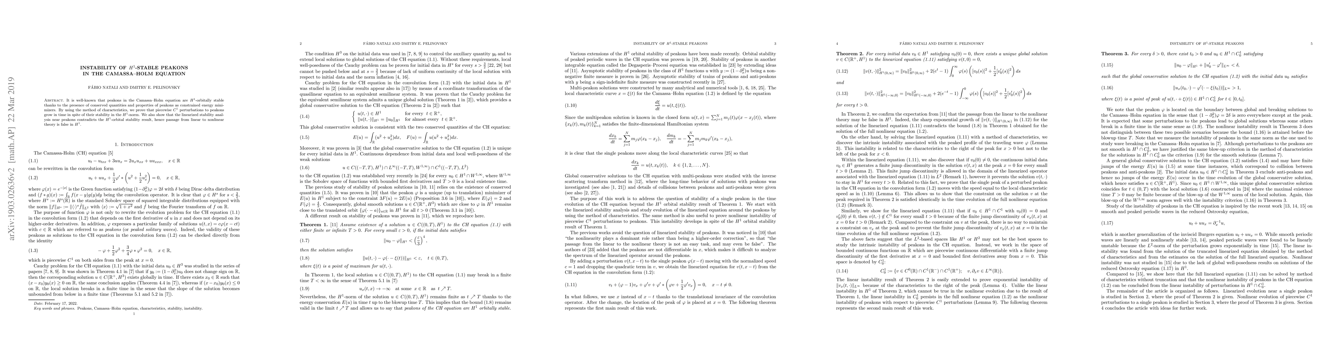Researchers show that $H^1$-stable peakons in the Camassa-Holm equation can still grow over time with small piecewise $C^1$ perturbations, contradicting previous linear stability analyses.