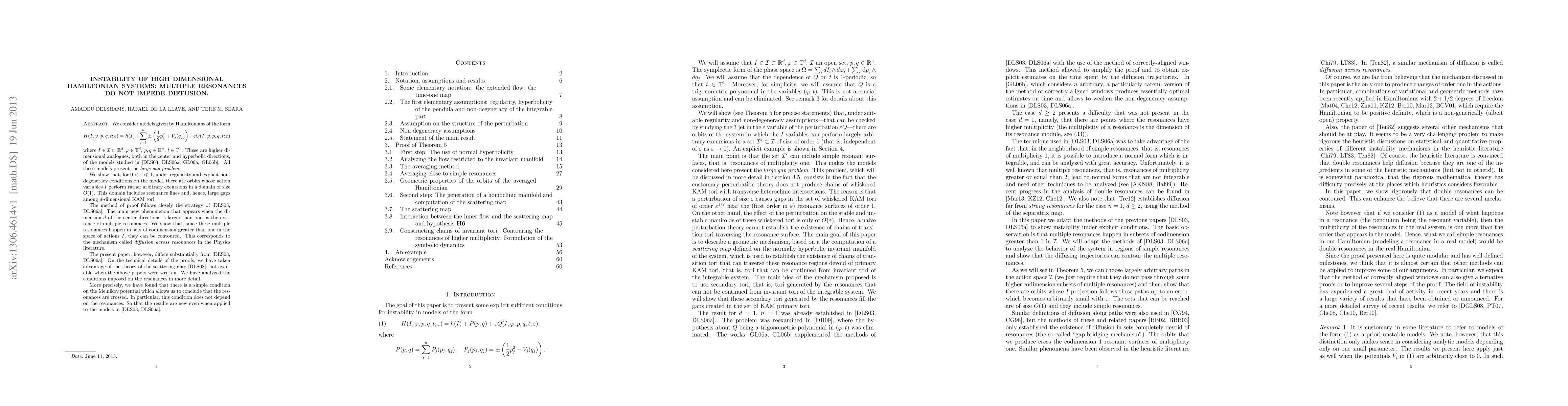 We consider models given by Hamiltonians of the form $$H(I,\phi,p,q,t;\epsilon) = h(I) + \sum_{j = 1}^n \pm(\frac{1}{2} p_j^2 + V_j(q_j)) + \epsilon Q(I,\phi,p,q,t;\epsilon)$$ where $I,\phi$ are d-dimensional actions and angles, $p,q$ are n-dimensional real conjugated variables, and $t$ is an angle. These are higher dimensional analogues, both in the center and hyperbolic directions, of the models studied in previous papers by the athors. All these models present the large gap problem. We show that, for $\epsilon$ small enough, under regularity and explicit non-degeneracy conditions on the model, there are orbits whose action variables $I$ perform rather arbitrary excursions in a domain of size O(1). This domain includes resonance lines and, hence, large gaps among $d$-dimensional KAM tori. The method of proof follows closely the strategy of [DLS(=Delshams, Llave and Seara) 2006]. The main new phenomenon that appears when the dimension $d$ of the center directions is larger than one, is the existence of multiple resonances. We show that, since these multiple resonances happen in sets of codimension greater than one in the space of actions $I$, they can be contoured. This corresponds to the mechanism called diffusion across resonances in the Physics literature. The present paper, however, differs substantially from [DLS 2006]. On the technical details of the proofs, we have taken advantage of the theory of the scattering map [DLS 2008], not available when the above papers were written. We have analyzed the conditions imposed on the resonances in more detail. More precisely, we have found that there is a simple condition on the Melnikov potential which allows us to conclude that the resonances are crossed. In particular, this condition does not depend on the resonances. So that the results are new even when applied to the models in [DLS 2006].