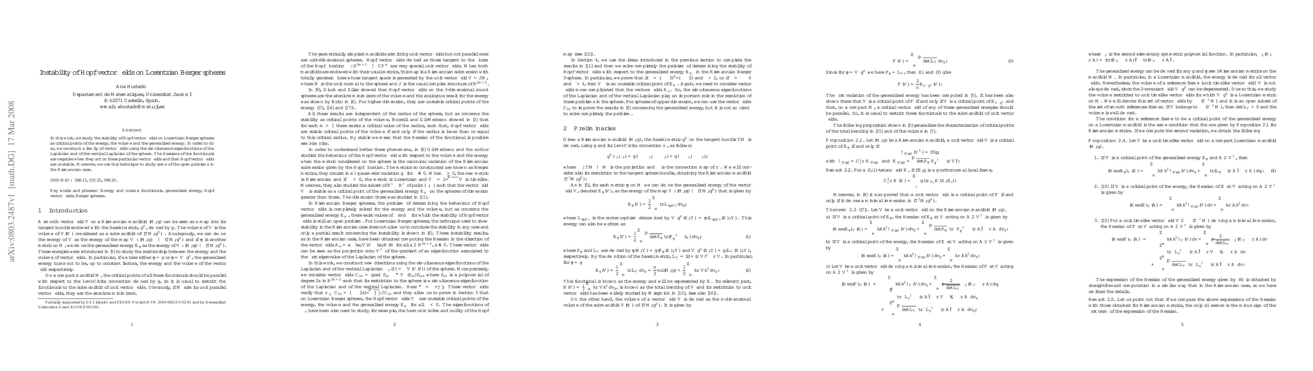 This paper investigates the instability of Hopf vector fields on Lorentzian Berger spheres by constructing a vector field family from simultaneous eigenfunctions of the Laplacian and vertical Laplacian, revealing that the Hessians of energy, volume, and generalized energy functionals are negative for these fields, confirming their instability. The method also extends insights to open problems in the Riemannian case.