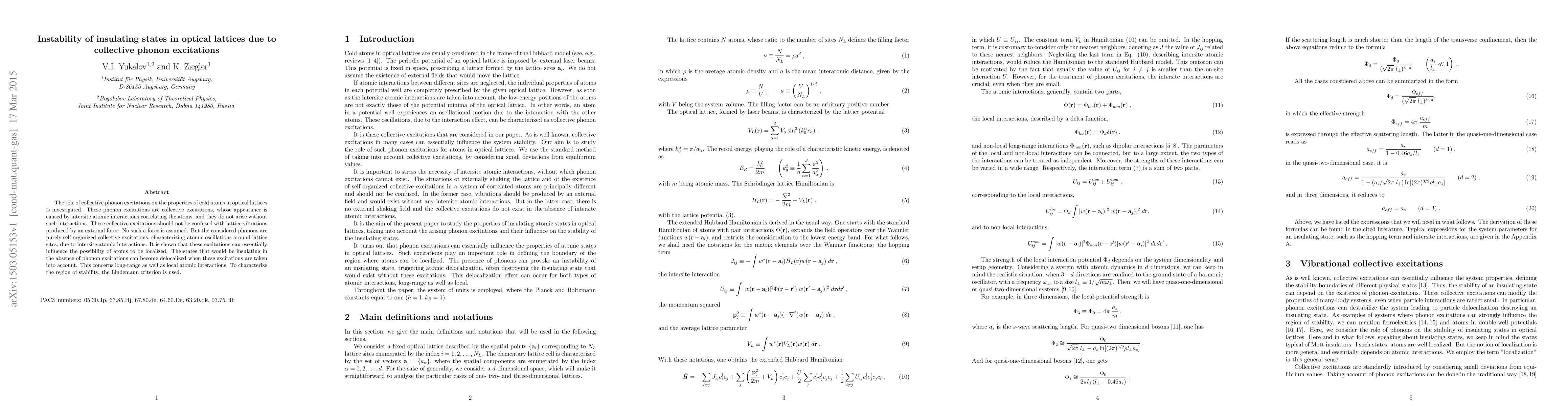 Summary: Collective phonon excitations due to intersite atomic interactions in optical lattices can destabilize insulating states, causing atoms to transition from localized to delocalized configurations. The Lindemann criterion is applied to define the stability region for these states.