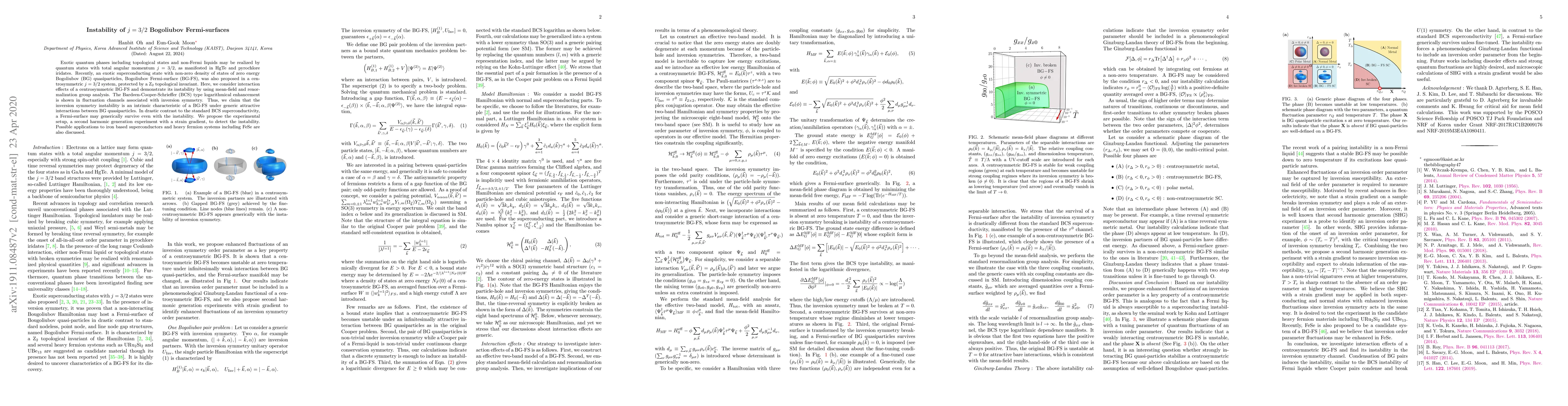 This paper investigates the instability of Bogoliubov Fermi-surfaces (BG-FS) in centrosymmetric systems with total angular momentum $j=3/2$, showing that attractive interactions lead to BCS-type logarithmical enhancement and instability. The study proposes a second harmonic generation experiment with strain gradient to detect this phenomenon and discusses its relevance to iron-based superconductors and heavy fermion systems.