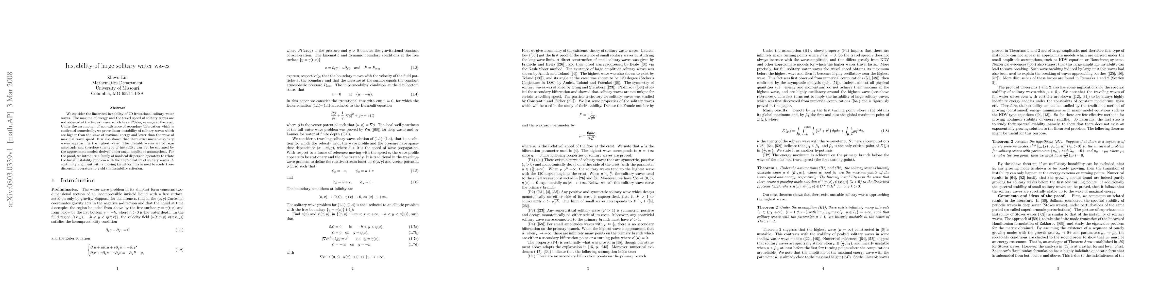 This paper investigates the linear instability of 2D irrotational solitary water waves, proving that waves higher than the wave of maximal energy and lower than the wave of maximal travel speed are unstable. The study introduces nonlocal dispersion operators and uses a continuity argument to establish the instability criterion for large amplitude waves, which cannot be captured by small amplitude models.