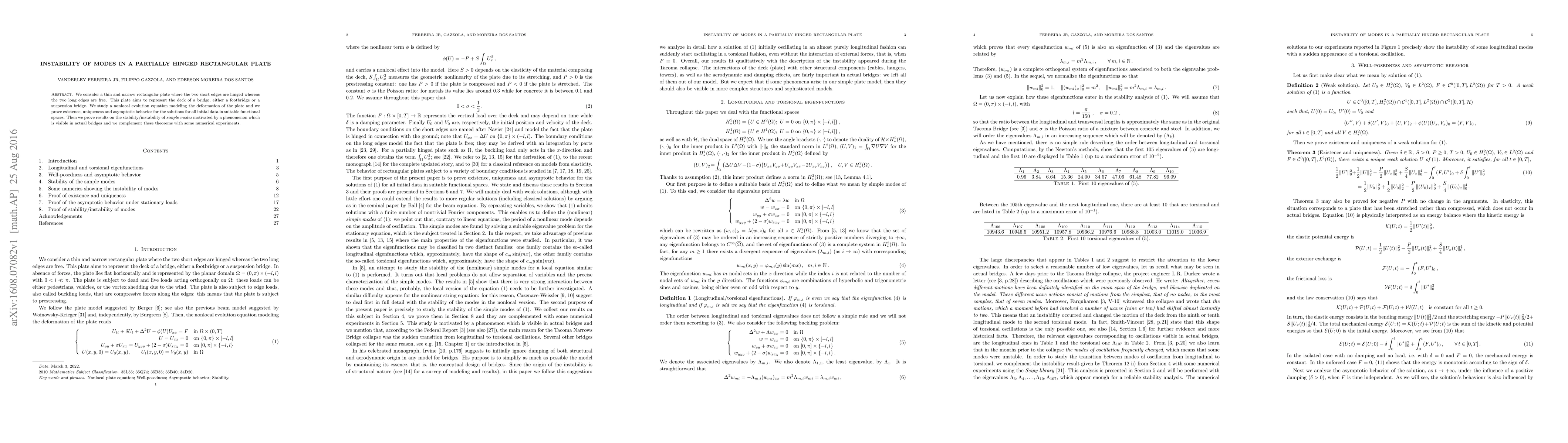 We consider a thin and narrow rectangular plate where the two short edges are hinged whereas the two long edges are free. This plate aims to represent the deck of a bridge, either a footbridge or a suspension bridge. We study a nonlocal evolution equation modeling the deformation of the plate and we prove existence, uniqueness and asymptotic behavior for the solutions for all initial data in suitable functional spaces. Then we prove results on the stability/instability of simple modes motivated by a phenomenon which is visible in actual bridges and we complement these theorems with some numerical experiments.