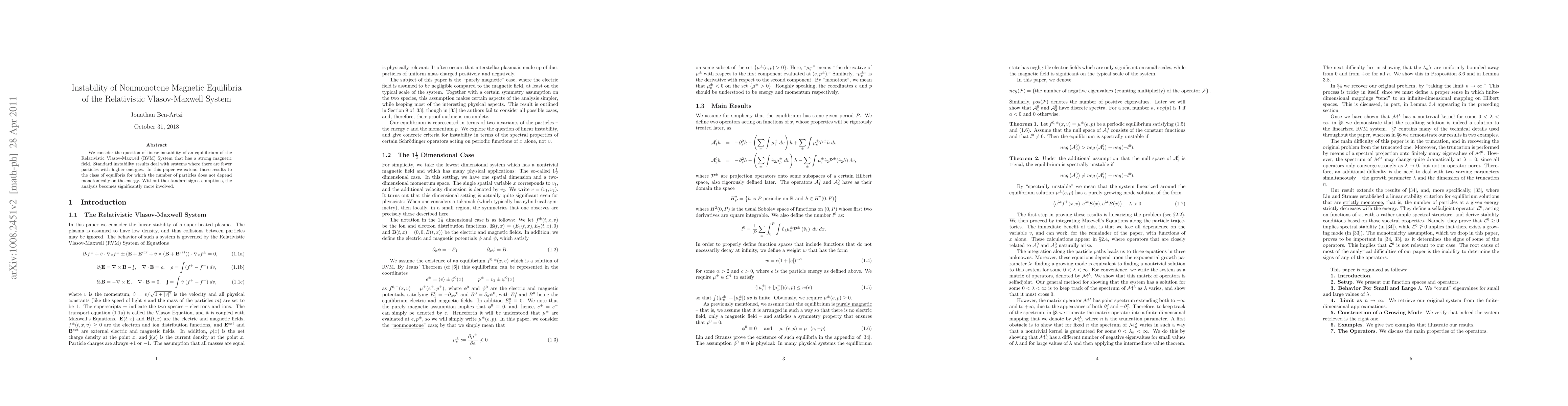 We consider the question of linear instability of an equilibrium of the Relativistic Vlasov-Maxwell (RVM) System that has a strong magnetic field. Standard instability results deal with systems where there are fewer particles with higher energies. In this paper we extend those results to the class of equilibria for which the number of particles does not depend monotonically on the energy. Without the standard sign assumptions, the analysis becomes significantly more involved.