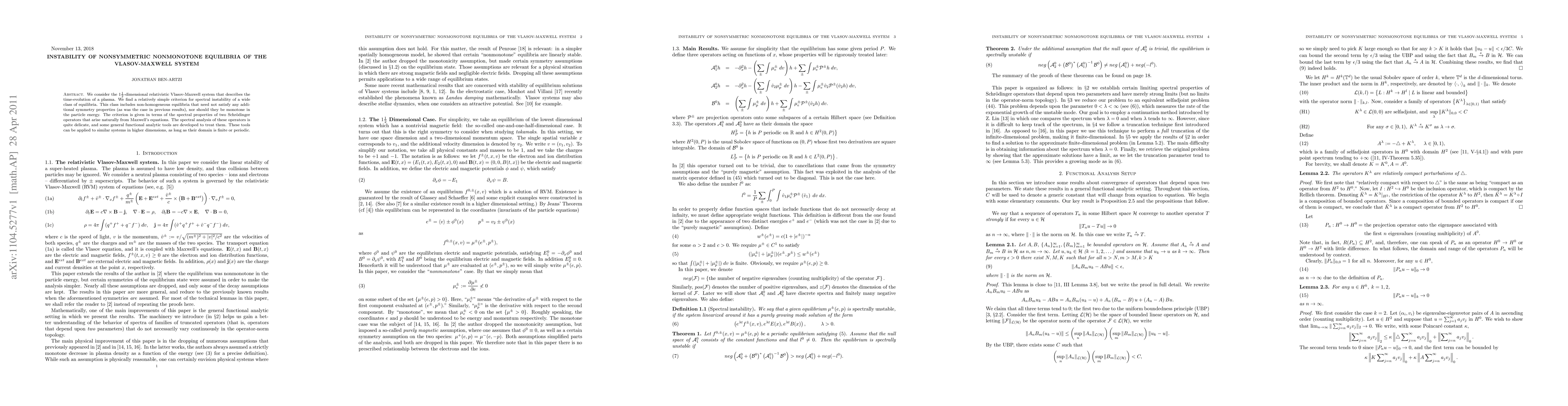 This paper investigates the spectral instability of nonsymmetric, nonmonotone equilibria in the 1/2-dimensional relativistic Vlasov-Maxwell system, providing a new criterion based on the spectral properties of Schrödinger operators derived from Maxwell's equations. The developed functional analytic tools are versatile and applicable to similar systems in higher dimensions with finite or periodic domains.