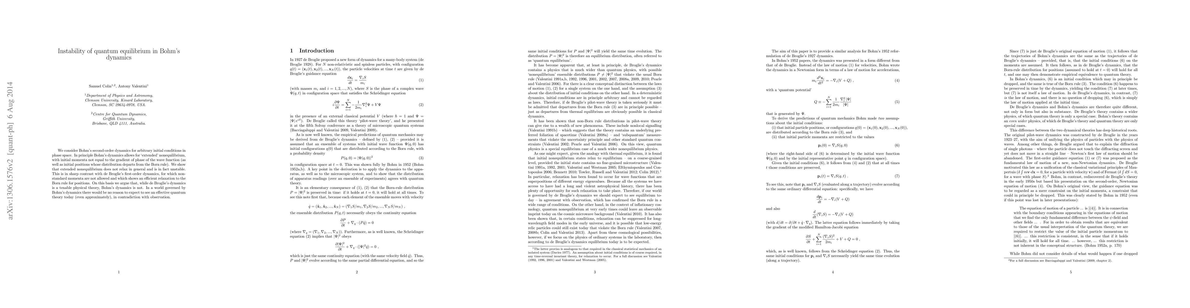 This paper investigates the instability of quantum equilibrium in Bohm's second-order dynamics, showing that extended nonequilibrium states do not relax and are inherently unstable. In contrast, de Broglie's first-order dynamics efficiently relaxes to the Born rule, leading to the conclusion that Bohm's dynamics is not a tenable physical theory.