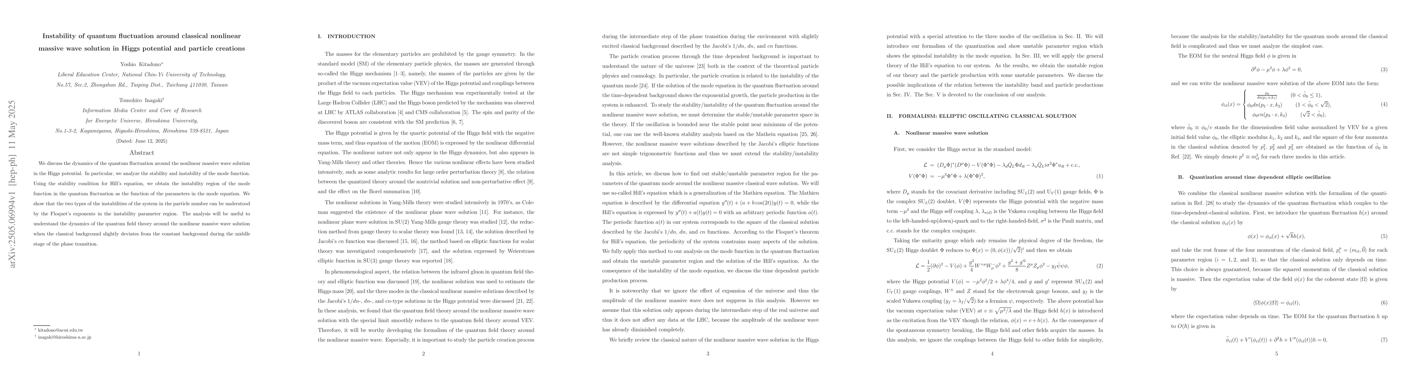 Research investigates instability of quantum fluctuations around a nonlinear massive wave solution in the Higgs potential, shedding light on particle creations during phase transitions. It identifies regions of instability based on stability conditions for Hill's equation.
