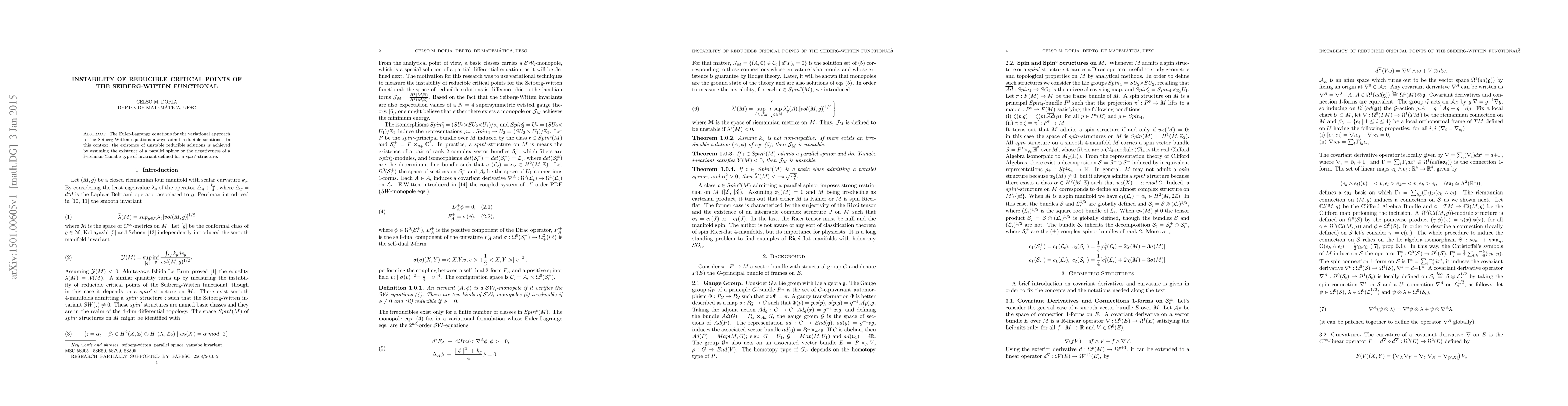 The Euler-Lagrange equations for the variational approach to the Seiberg-Witten equations always admit reducible solutions. In this context, the existence of unstable reducible solutions is achieved by assuming the existence of a parallel spinor or the negativeness of a Perelman-Yamabe type of invariant defined for a $\spinc$-structure.