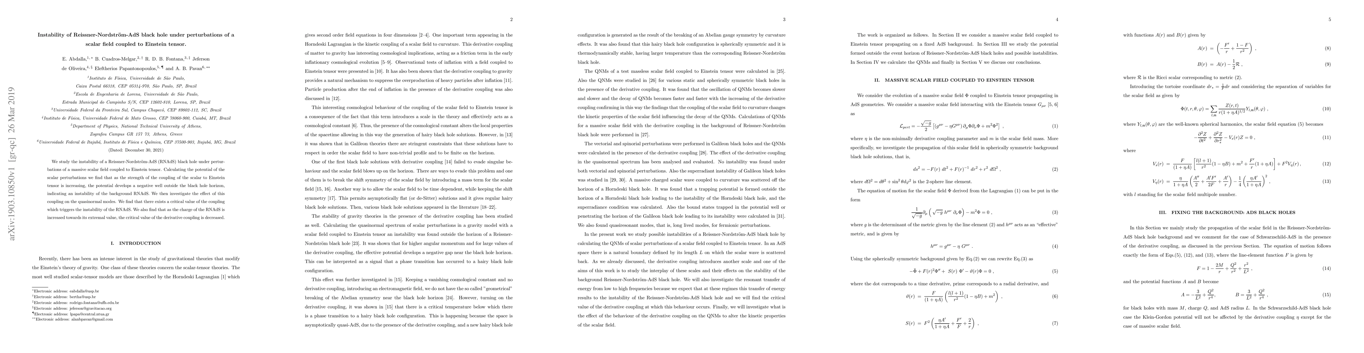 This paper examines the instability of Reissner-Nordström-AdS (RNAdS) black holes under perturbations by a massive scalar field coupled to the Einstein tensor, revealing a negative potential well indicating instability as coupling strength increases. It identifies a critical coupling value that triggers this instability, with higher RNAdS charge reducing the critical coupling threshold.