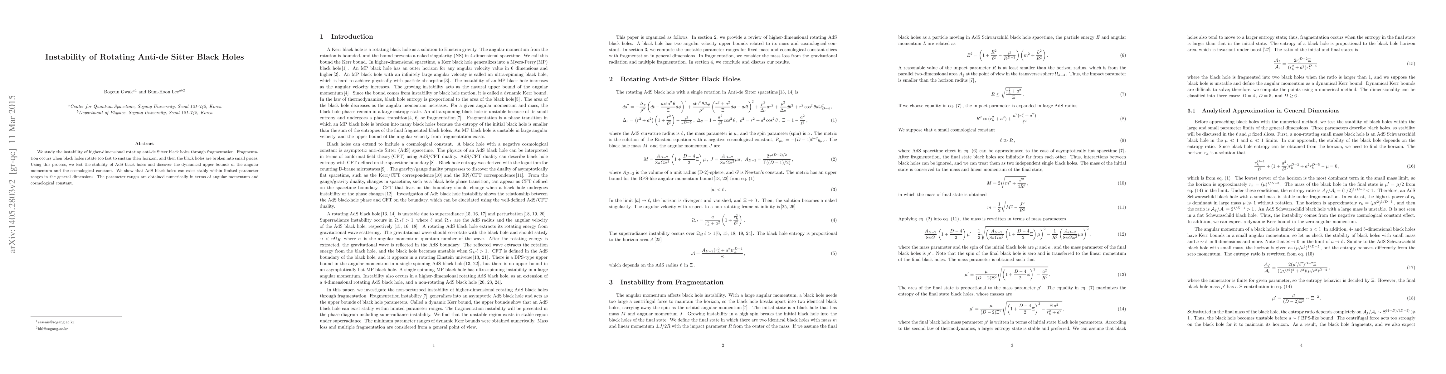 The study investigates the instability of rotating anti-de Sitter (AdS) black holes through fragmentation, analyzing stability within general dimensions by testing limits and using numerical methods to compute points.