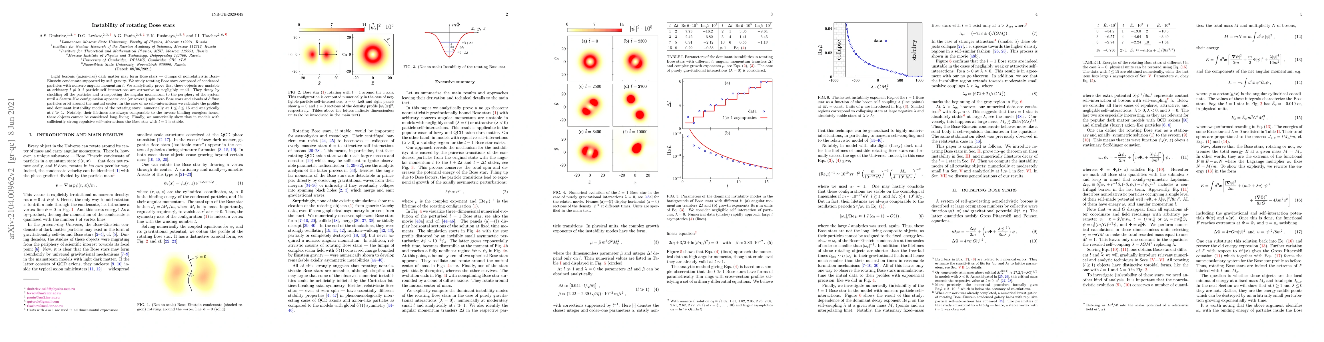 Light bosonic (axion-like) dark matter may form Bose stars - clumps of nonrelativistic Bose-Einstein condensate supported by self-gravity. We study rotating Bose stars composed of condensed particles with nonzero angular momentum $l$. We analytically prove that these objects are unstable at arbitrary $l \ne 0$ if particle self-interactions are attractive or negligibly small. They decay by shedding off the particles and transporting the angular momentum to the periphery of the system until a Saturn-like configuration appears: one (or several) spin-zero Bose stars and clouds of diffuse particles orbit around the mutual center. In the case of no self-interactions we calculate the profiles and dominant instability modes of the rotating stars: numerically at $1 \leq l\leq 15$ and analytically at $l\gg 1$. Notably, their lifetimes are always comparable to the inverse binding energies; hence, these objects cannot be considered long-living. Finally, we numerically show that in models with sufficiently strong repulsive self-interactions the Bose star with $l=1$ is stable.