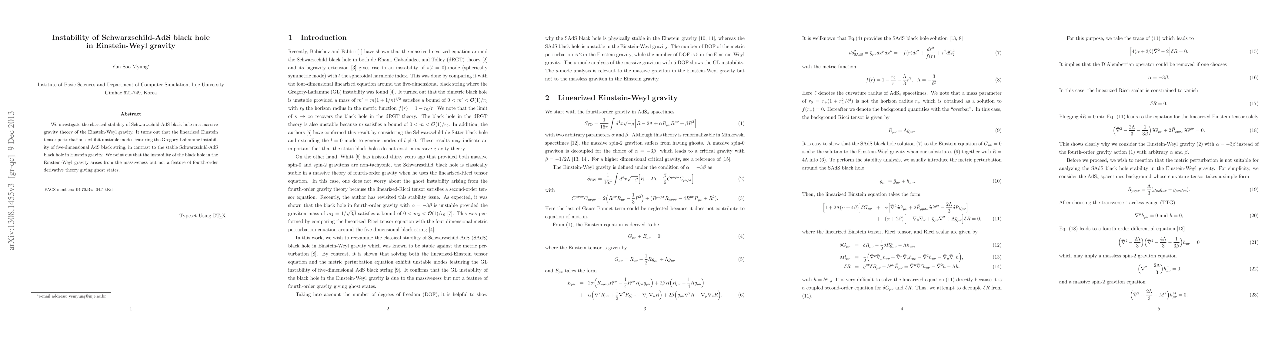 This paper examines the classical stability of Schwarzschild-AdS black holes within the framework of Einstein-Weyl gravity, revealing that they exhibit unstable modes indicative of Gregory-Laflamme instability, contrasting with the stability of such black holes in this theory. The instability is attributed to the massiveness rather than the fourth-order derivative terms that could introduce ghost states.