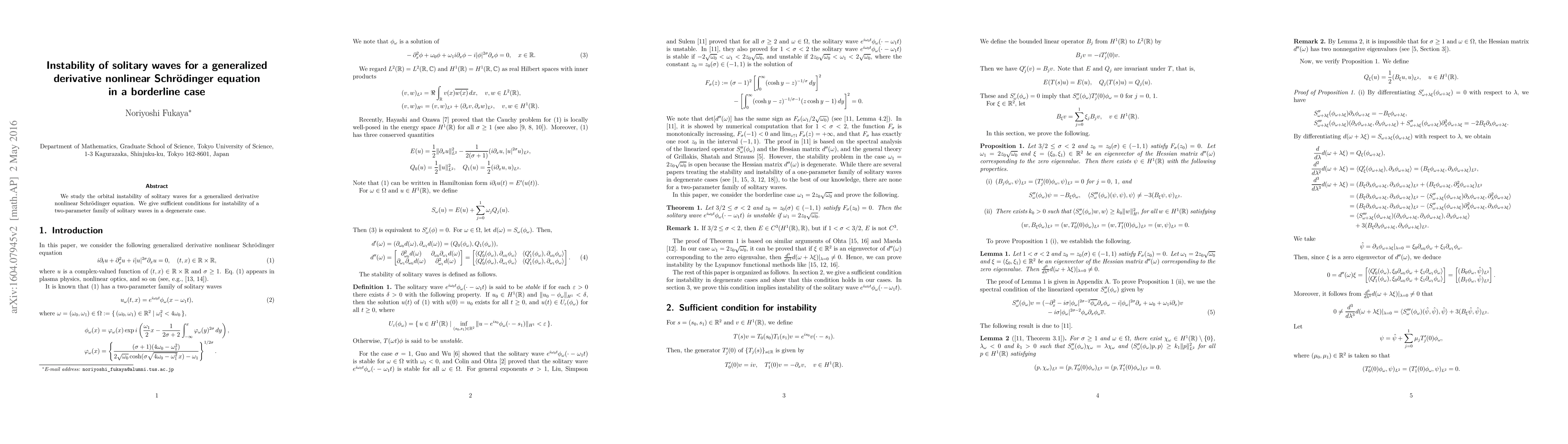 This paper investigates the orbital instability of solitary waves for a generalized derivative nonlinear Schrödinger equation, providing sufficient conditions for instability within a two-parameter family of solitary waves in a borderline degenerate case.