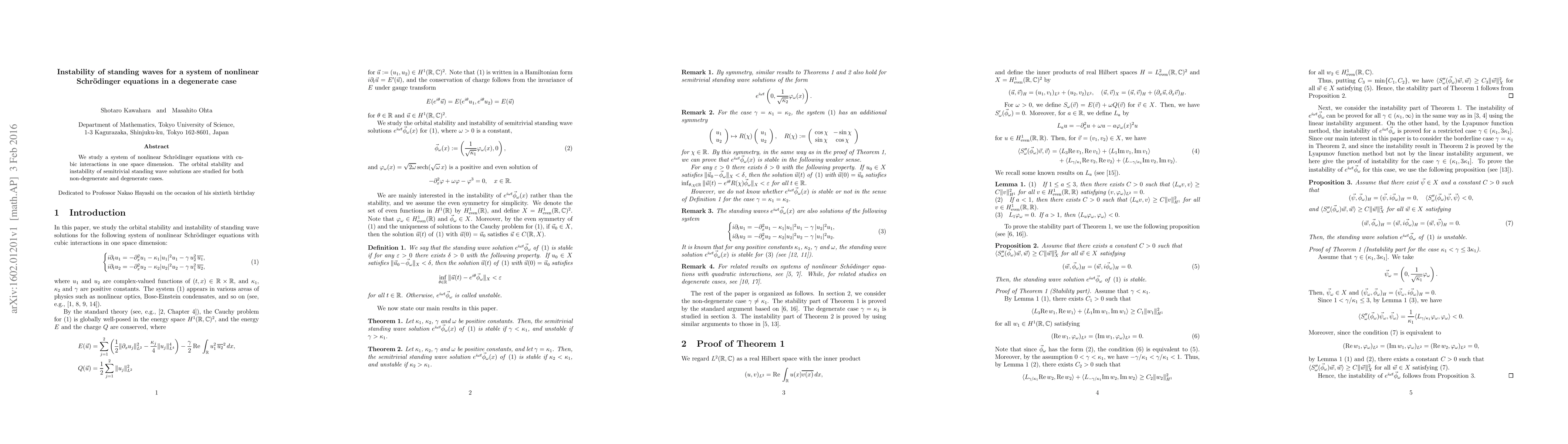 We study a system of nonlinear Schr\"odinger equations with cubic interactions in one space dimension. The orbital stability and instability of semitrivial standing wave solutions are studied for both non-degenerate and degenerate cases.