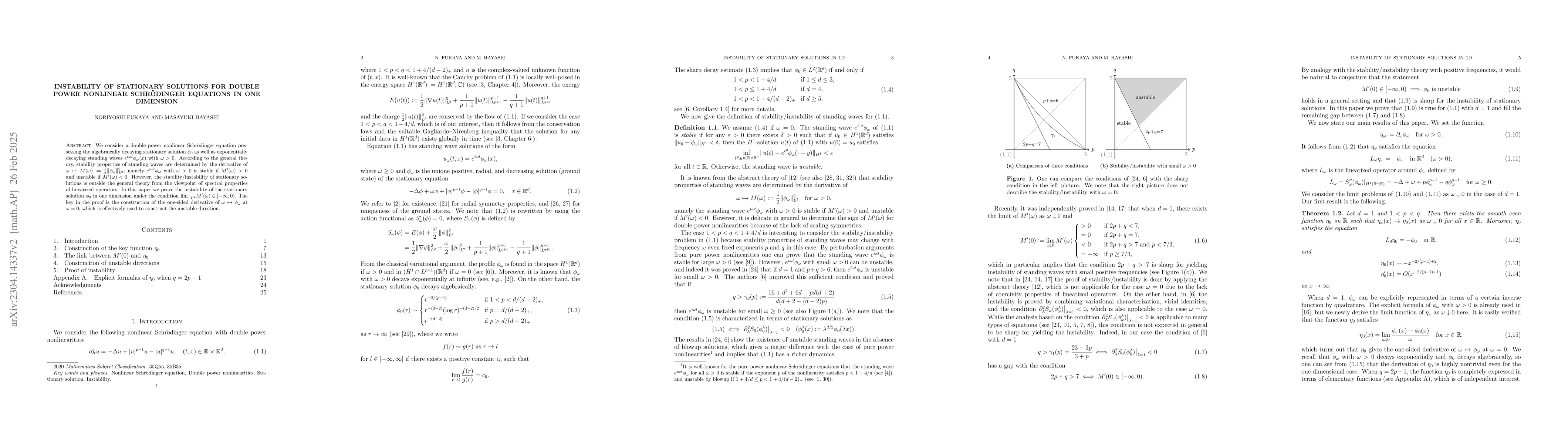 This paper investigates the instability of stationary solutions for a double power nonlinear Schrödinger equation in one dimension, proving that the stationary solution $\phi_0$ is unstable when $M'(0) \in [-\infty, 0)$. The key method involves constructing the one-sided derivative of $\omega \mapsto \phi_\omega$ at $\omega = 0$ to identify an unstable direction for $\phi_0$.