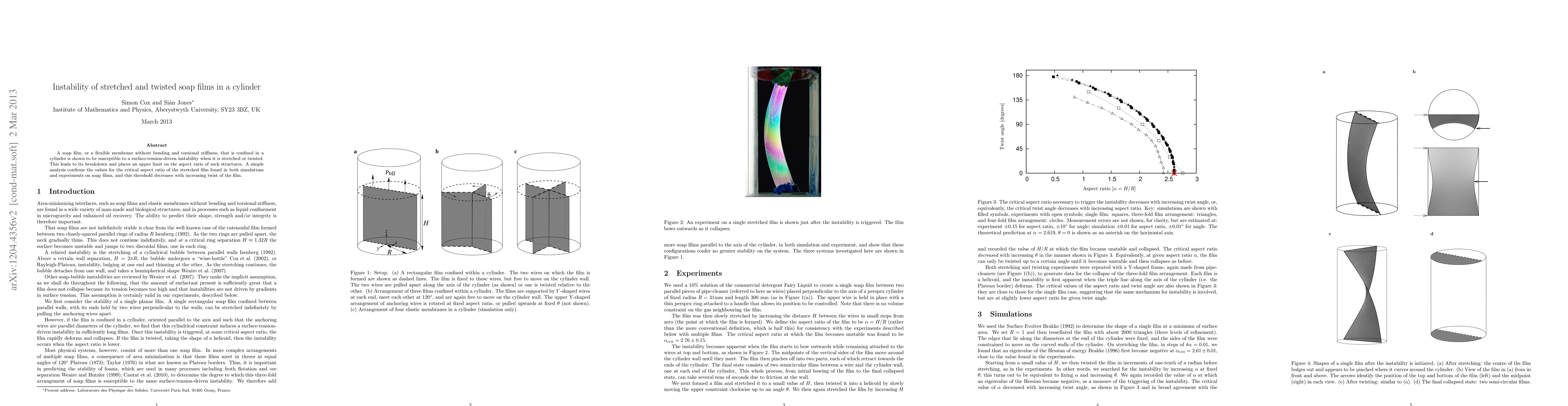 A soap film, or a flexible membrane without bending and torsional stiffness, that is confined in a cylinder is shown to be susceptible to a surface-tension-driven instability when it is stretched or twisted. This leads to its breakdown and places an upper limit on the aspect ratio of such structures. A simple analysis confirms the values for the critical aspect ratio of the stretched film found in both simulations and experiments on soap films, and this threshold decreases with increasing twist of the film.