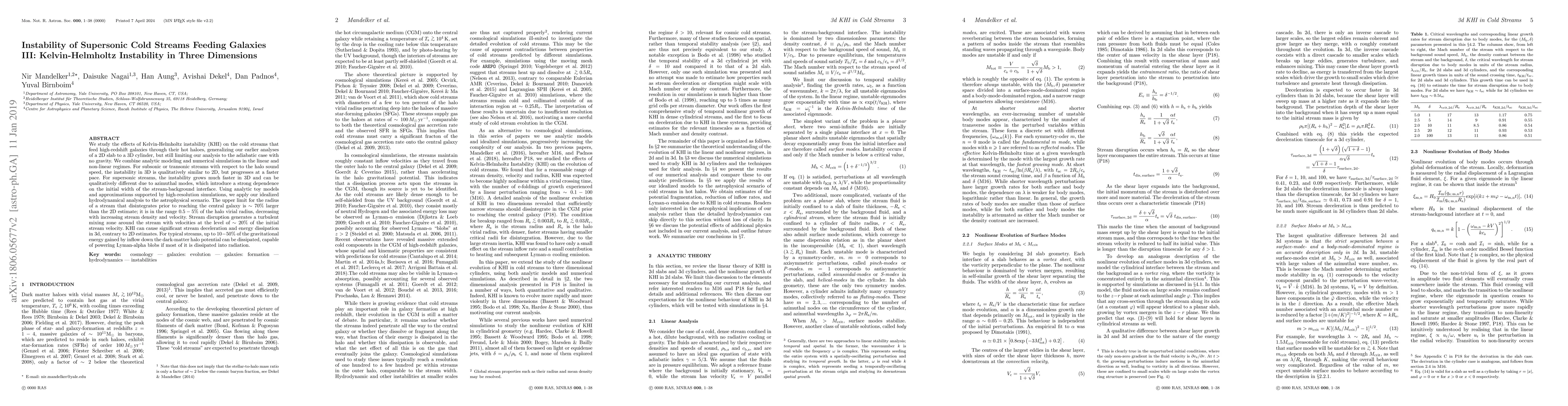 This paper investigates the Kelvin-Helmholtz instability (KHI) in supersonic cold streams feeding high-redshift galaxies through their hot halos, transitioning from 2D to 3D models. The 3D analysis reveals faster instability growth and significant stream deceleration and energy dissipation, with up to 50% of gravitational energy potentially dissipated, impacting astrophysical phenomena like Lyman-alpha blobs.