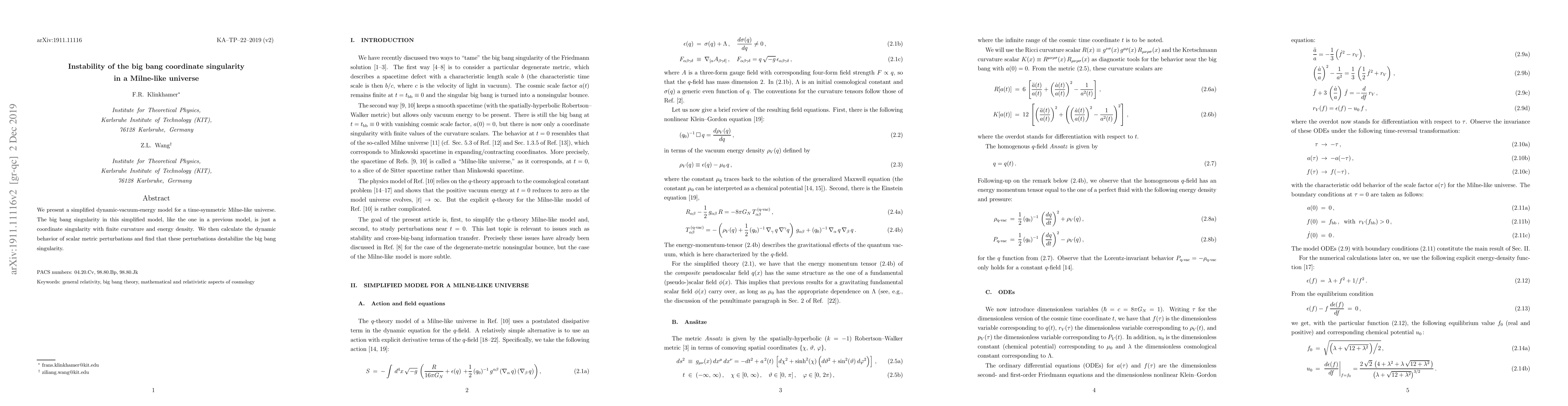 The paper proposes a simplified dynamic-vacuum-energy model for a Milne-like universe, showing that the big bang singularity is a coordinate singularity with finite curvature and energy density. It finds that scalar metric perturbations destabilize this singularity.