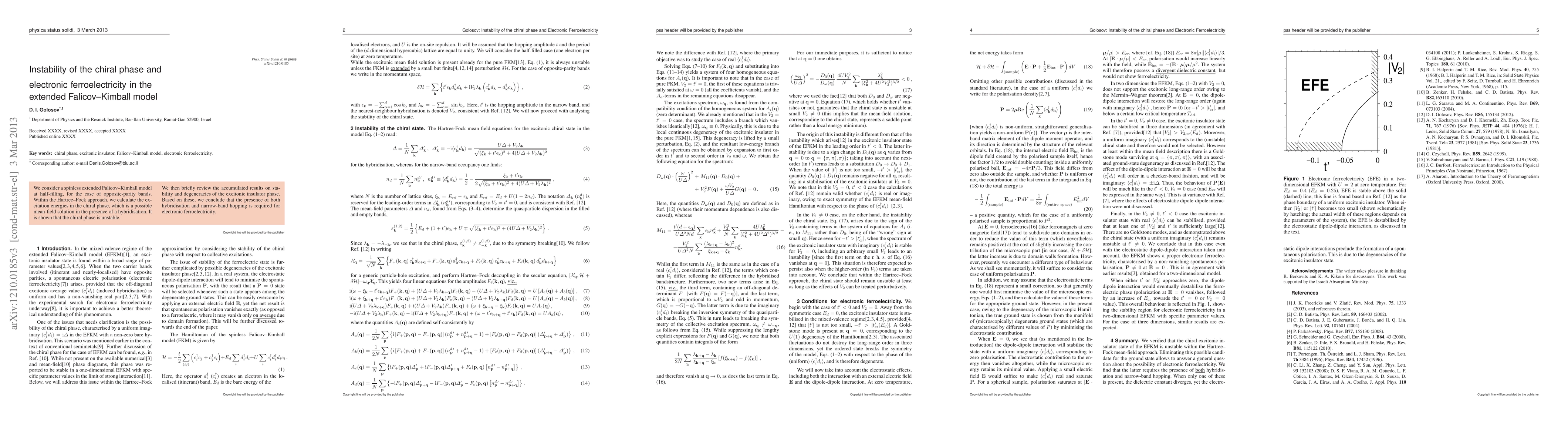 This paper investigates the instability of the chiral phase in the extended Falicov-Kimball model using the Hartree-Fock approach, revealing its instability. It concludes that electronic ferroelectricity requires both hybridisation and narrow-band hopping.