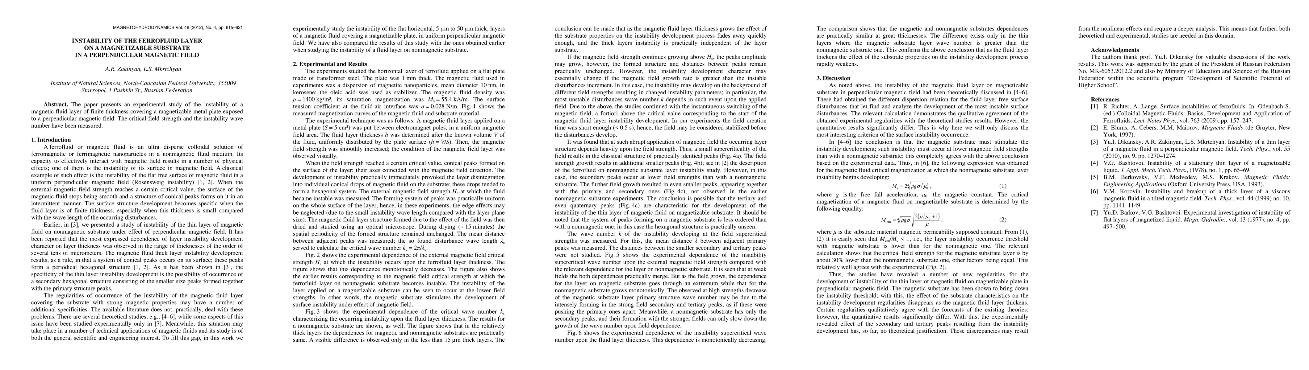 The paper presents an experimental study of the instability of a magnetic fluid layer of finite thickness covering a magnetizable metal plate exposed to a perpendicular magnetic field. The critical field strength and the instability wave number have been measured.