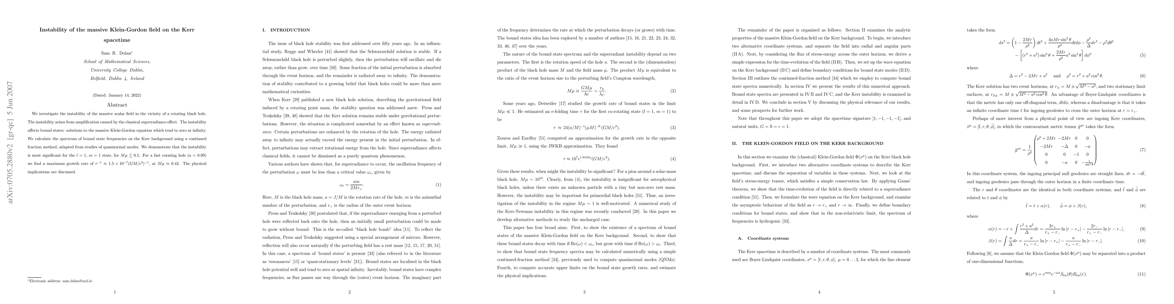 Research finds massive scalar fields on rotating black holes to be unstable due to amplification from classical superradiance effects, with instability strongest for $l = 1$, $m = 1$ states.