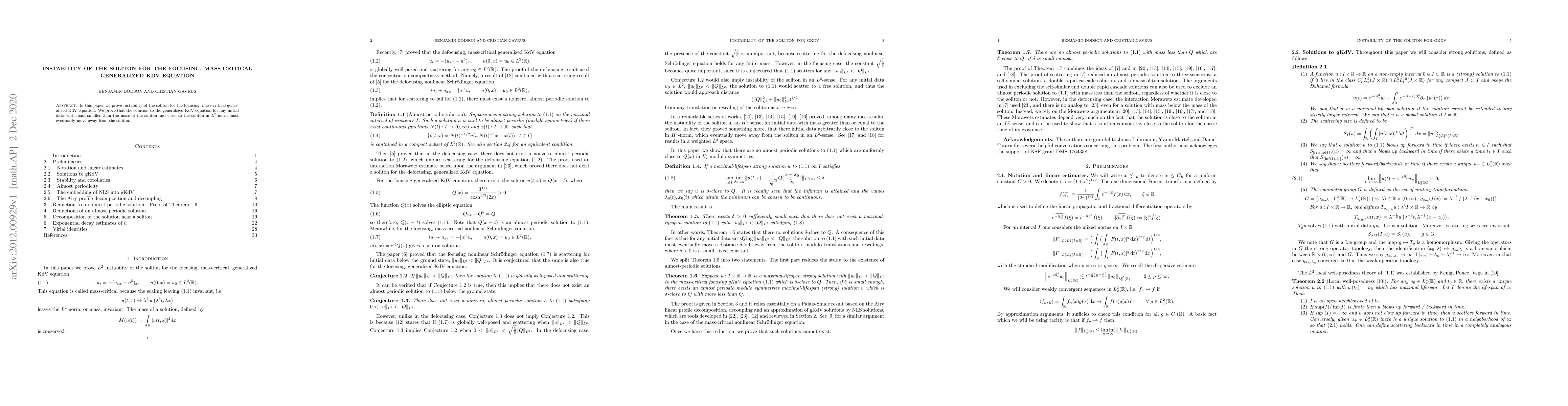 This paper demonstrates the instability of solitons in the focusing, mass-critical generalized KdV equation, showing that solutions with initial mass less than the soliton's mass and close in $L^{2}$ norm will eventually diverge from the soliton.