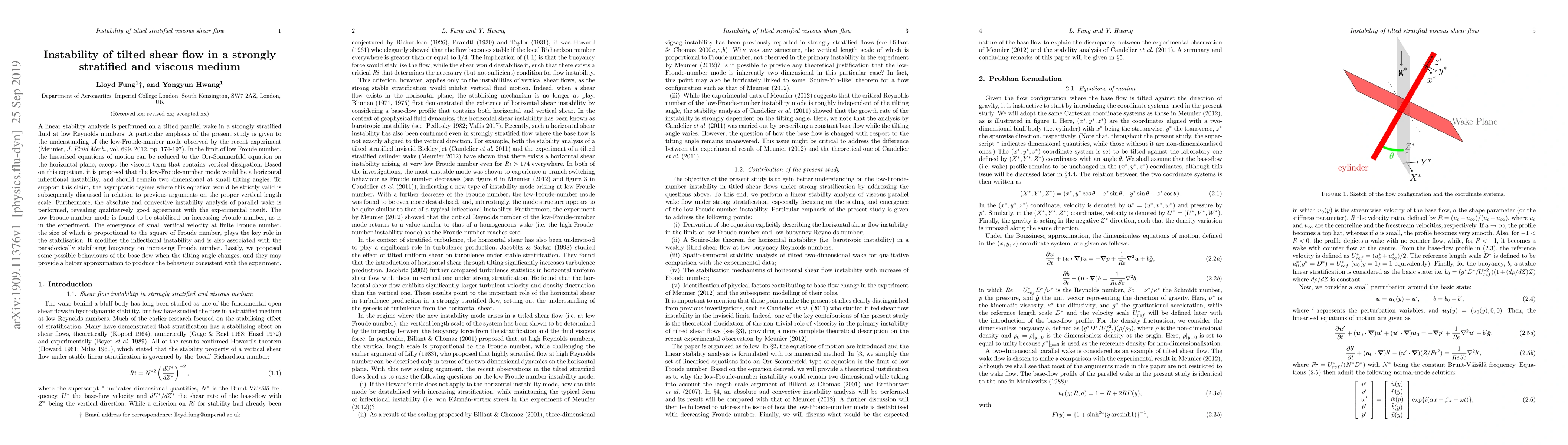 A linear stability analysis is performed on a tilted parallel wake in a strongly stratified fluid at low Reynolds numbers. A particular emphasis of the present study is given to the understanding of the low-Froude-number mode observed by the recent experiment (Meunier, J. Fluid Mech., vol. 699, 2012, pp. 174-197). In the limit of low Froude number, the linearised equations of motion can be reduced to the Orr-Sommerfeld equation on the horizontal plane, except the viscous term that contains vertical dissipation. Based on this equation, it is proposed that the low-Froude-number mode would be a horizontal inflectional instability, and should remain two dimensional at small tilting angles. To support this claim, the asymptotic regime where this equation would be strictly valid is subsequently discussed in relation to previous arguments on the proper vertical length scale. Furthermore, the absolute and convective instability analysis of parallel wake is performed, revealing qualitatively good agreement with the experimental result. The low-Froude-number mode is found to be stabilised on increasing Froude number, as is in the experiment. The emergence of small vertical velocity at finite Froude number, the size of which is proportional to the square of Froude number, plays the key role in the stabilisation. It modifies the inflectional instability and is also associated with the paradoxically stabilising buoyancy on increasing Froude number. Lastly, we proposed some possible behaviours of the base flow when the tilting angle changes, and they may provide a better approximation to produce the behaviour consistent with the experiment.